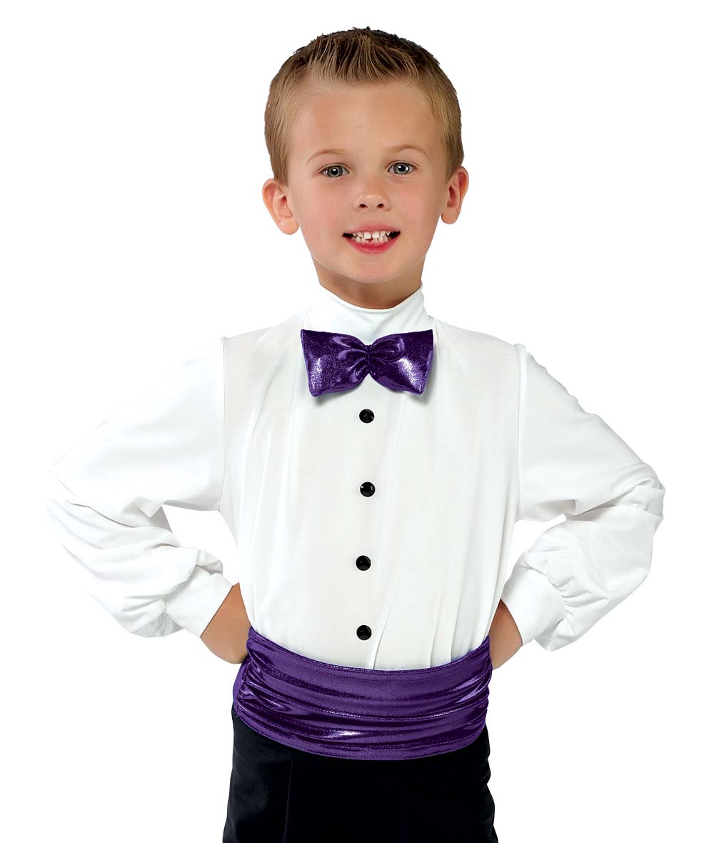 White spandex pullover shirt with attached faux buttons and bow tie. Made in the USA.