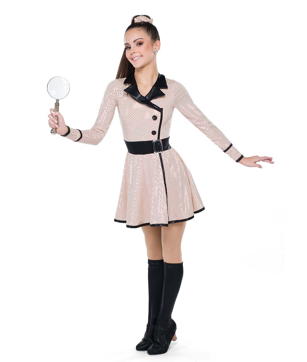 Sequin dot spandex long sleeve dress with foil lycra trim over attached leotard. Attached sequin applique buttons, belt buckle and zipper back. Hat and boot covers sold separately. Made in the USA.