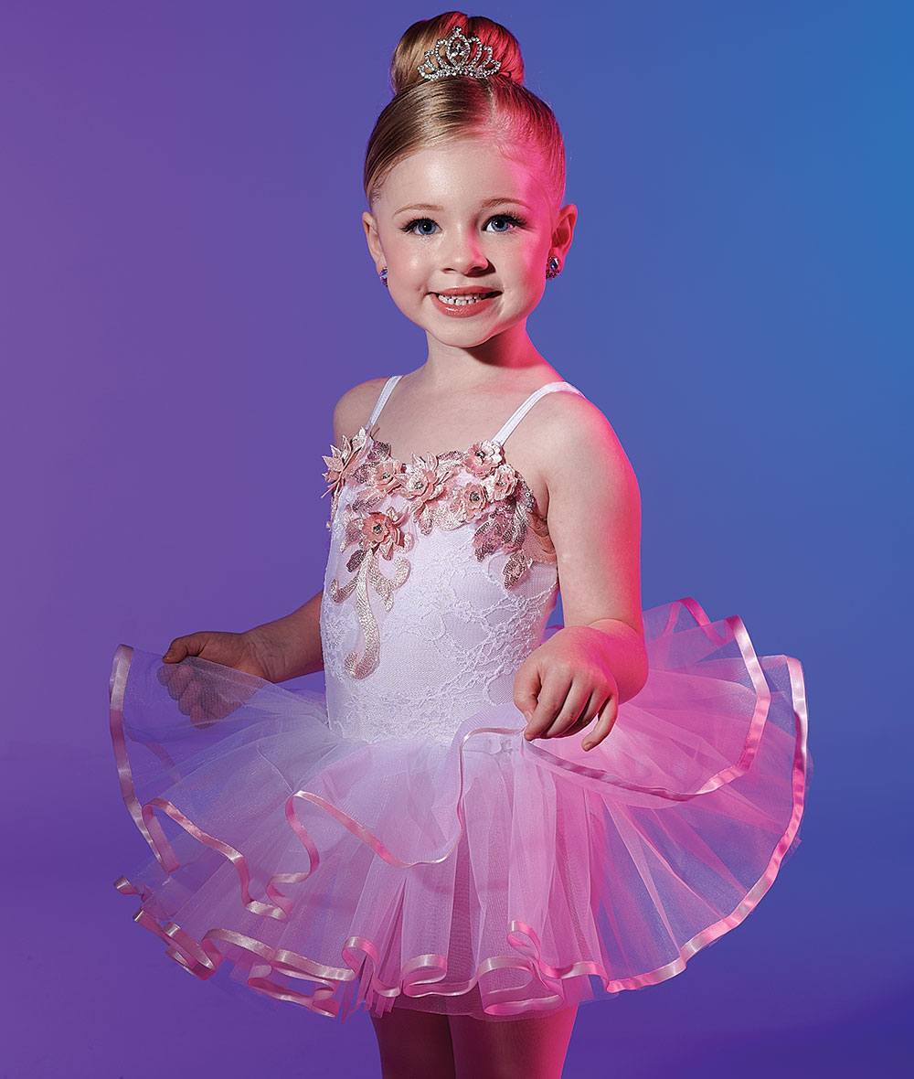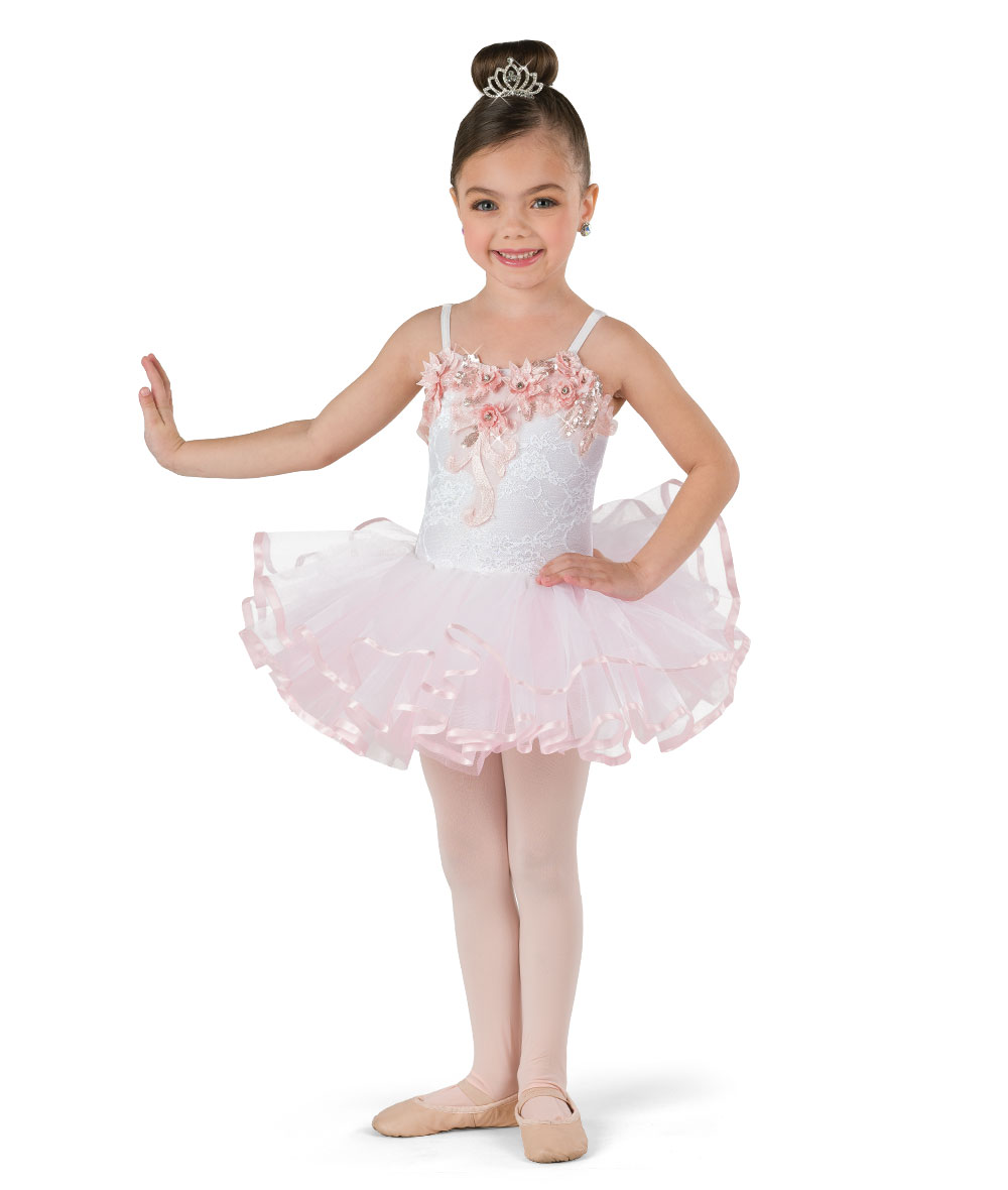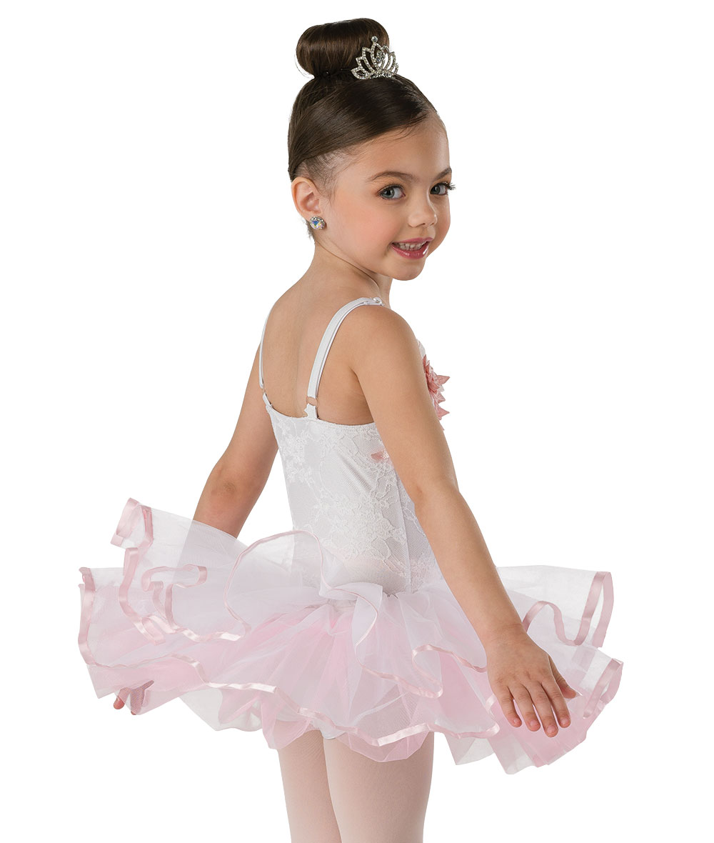 Lined floral lace and spandex leotard with attached floral applique and adjustable straps. Attached ribbon trimmed organza tutu. Imported.