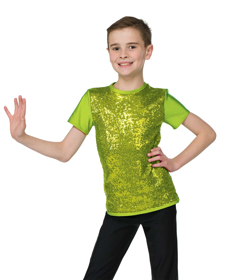 Lined elite sequin and solid spandex top. Pants sold separately. Made in the USA.
