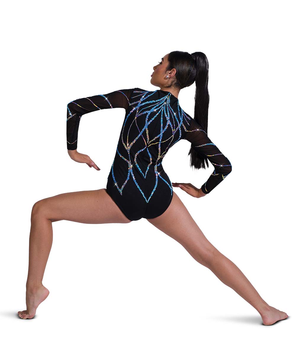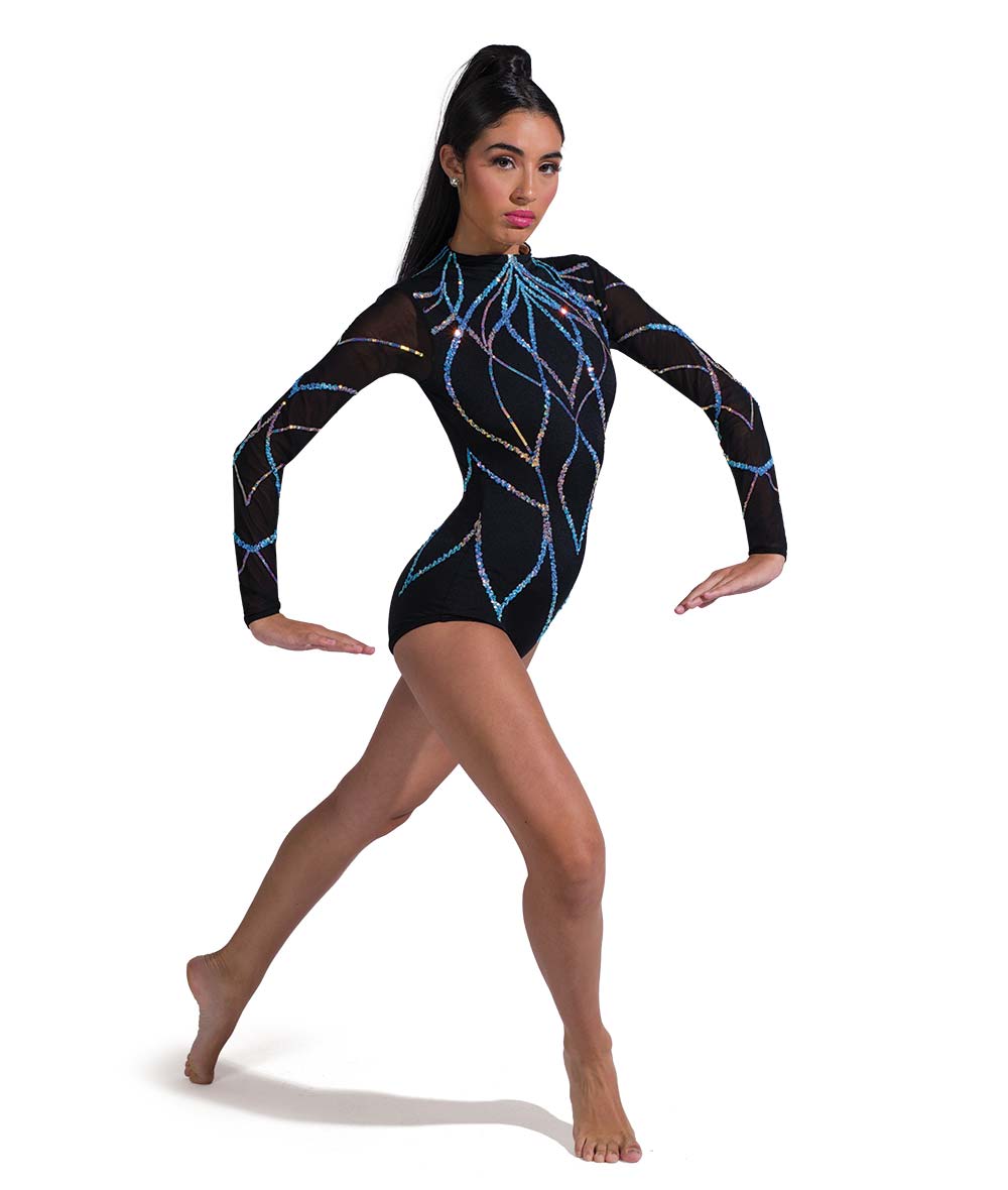Placement iridescent sequin spandex and mesh long sleeve leotard with funnel neck. Zipper back. Imported.