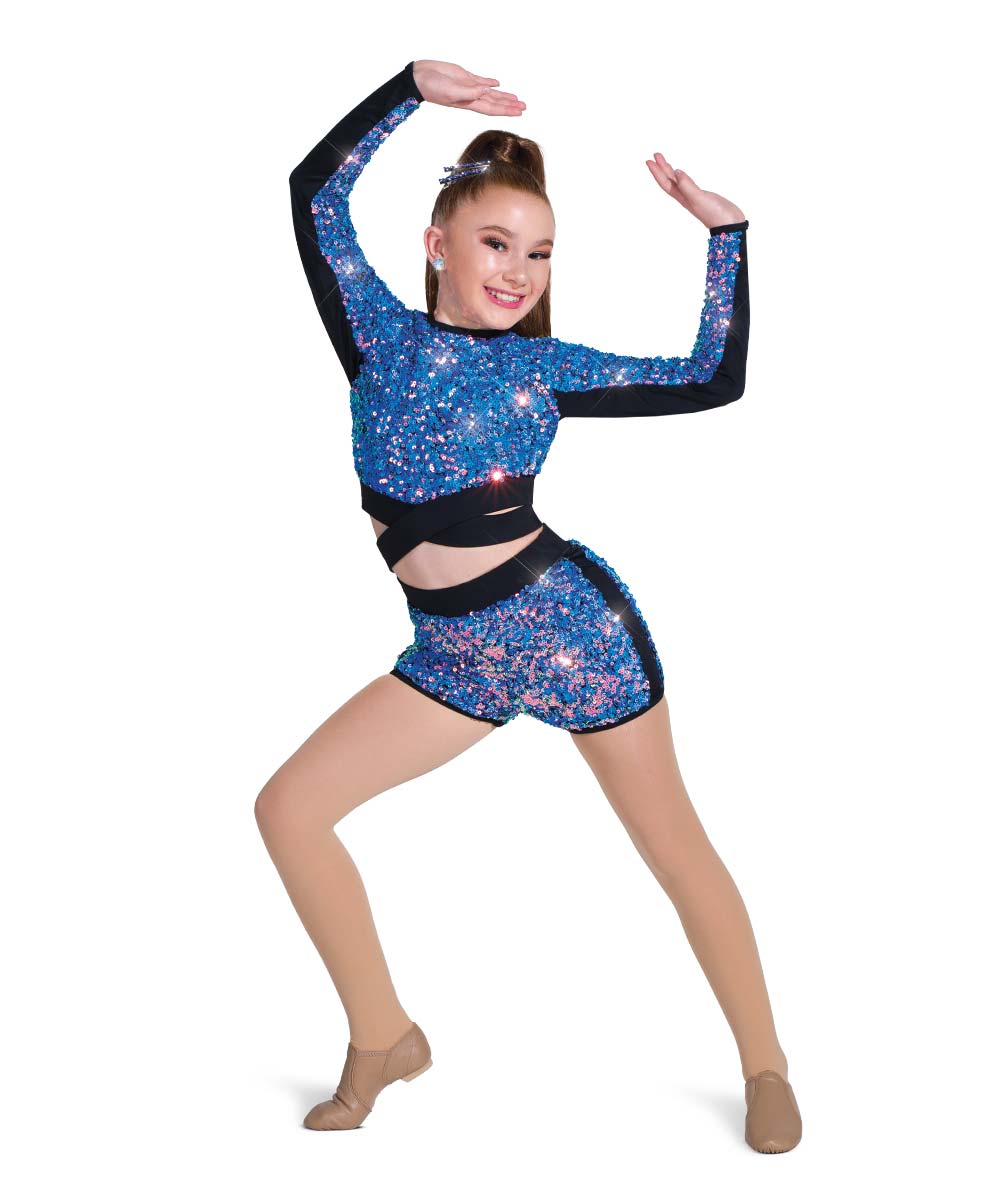 Lined iridescent sequin mesh and spandex long sleeve crop top with midriff straps. Lined sequin mesh and spandex high-waisted hot pants. Imported.