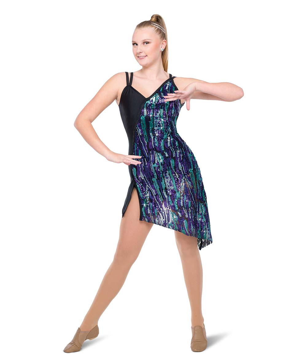 Lined sequin pattern mesh and spandex dress over attached leotard. Made in the USA.