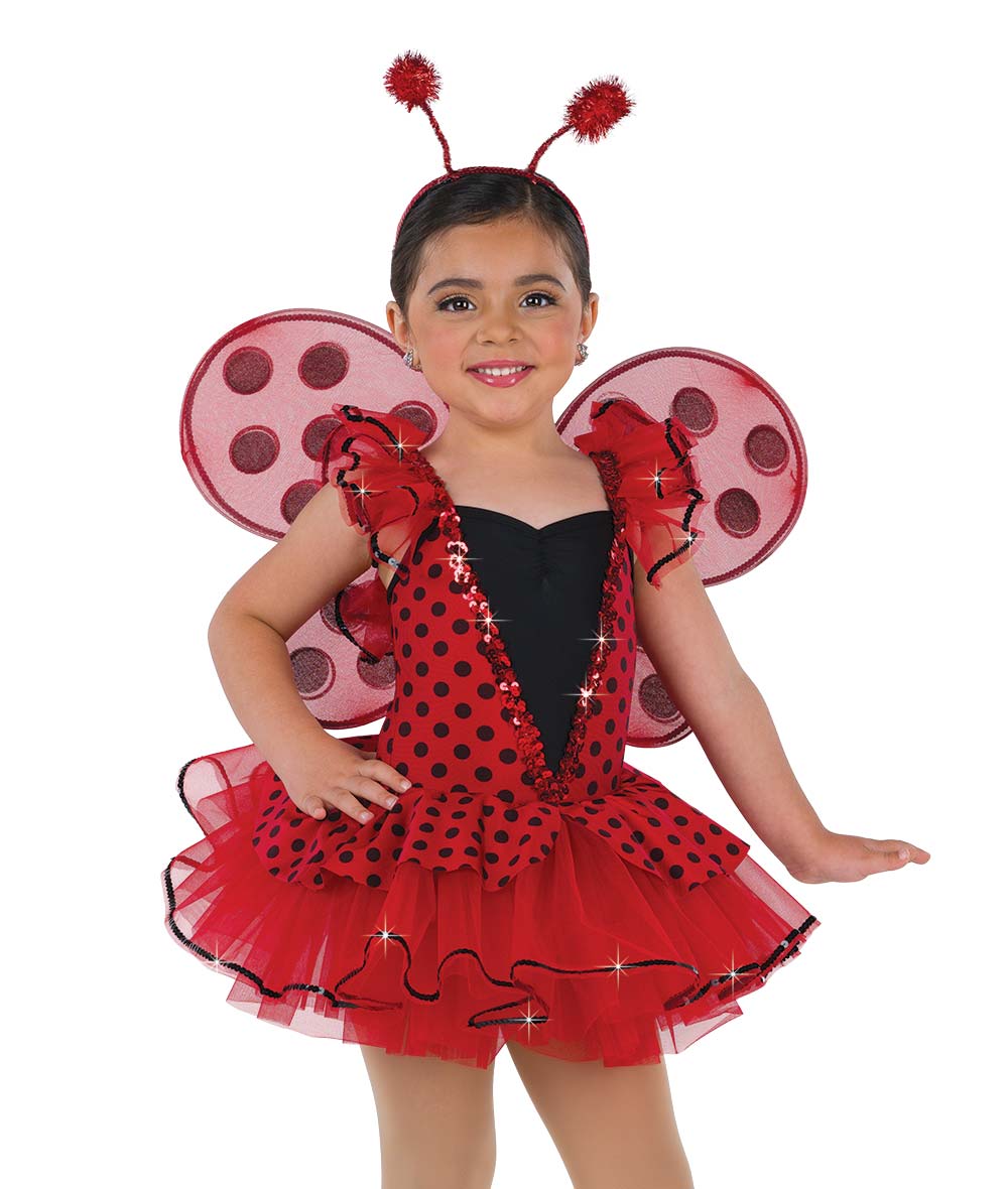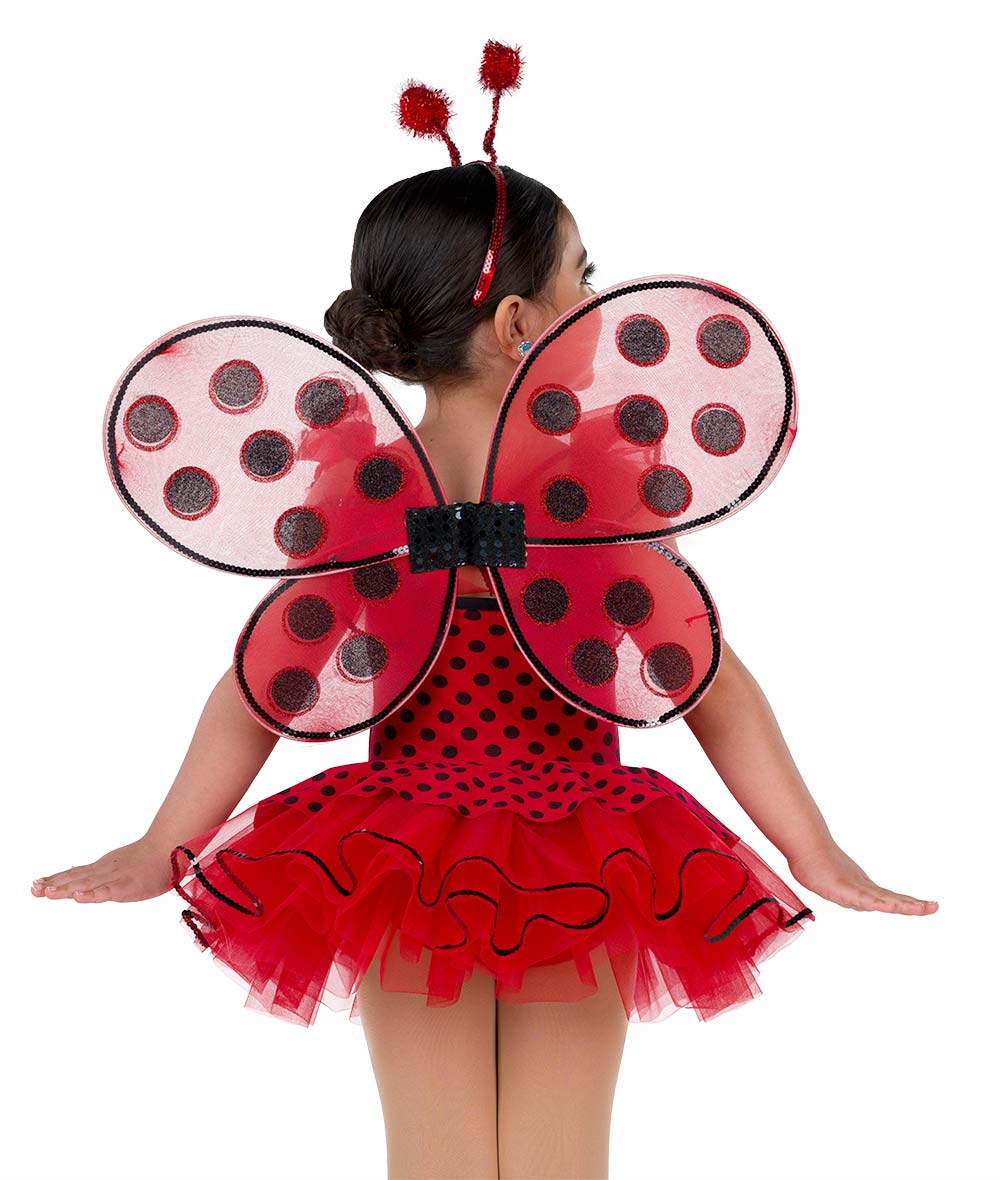 Polka dot and solid spandex skirted leotard with attached sequin trim. Attached sequin trimmed organza ruffle sleeves and tutu. Shoe bows sold separately. Made in the USA.