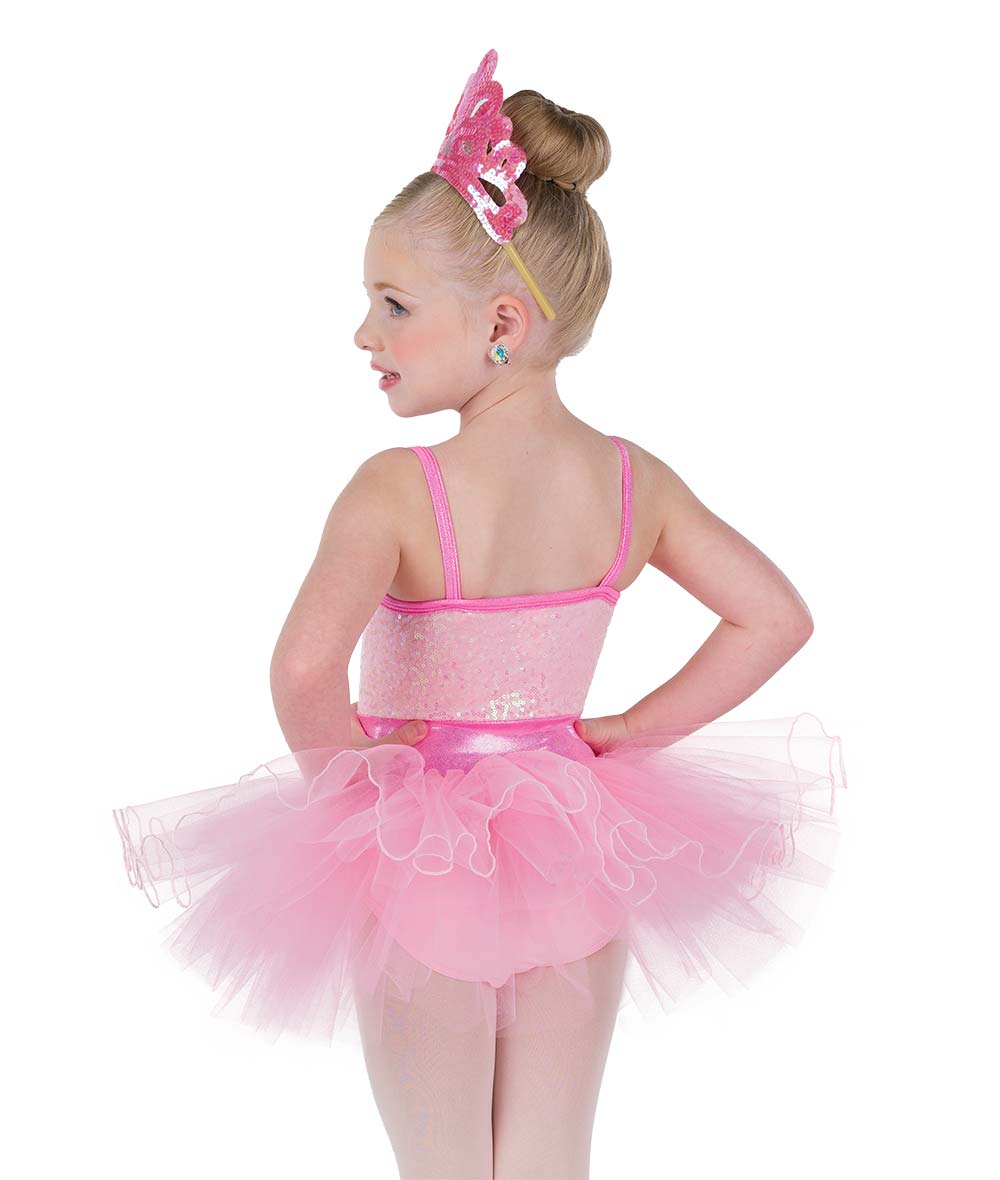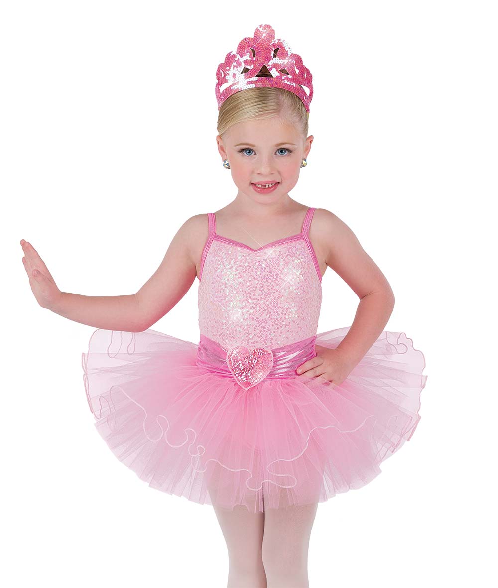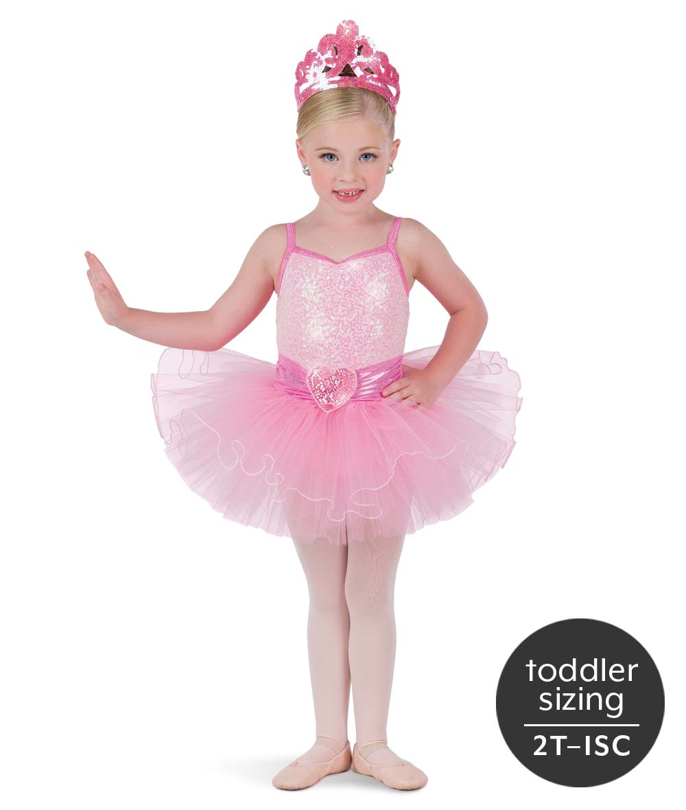 Lined sequin and solid spandex leotard with sequin heart on foil lycra waistband. Attached lettuce edged tulle tutu. Made in the USA.