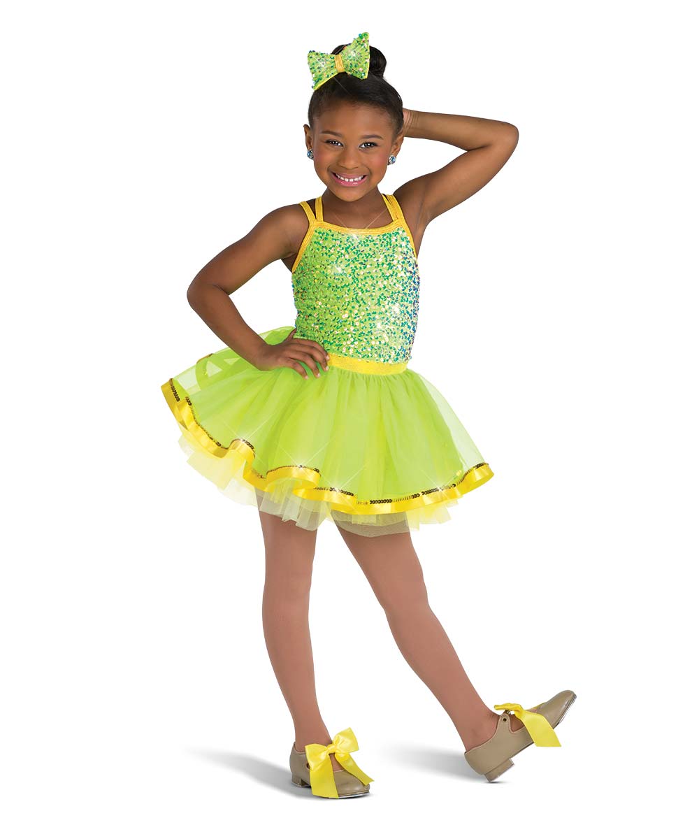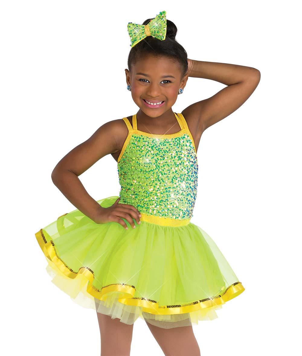 Sequin velvet and spandex leotard with foil lycra trim. Attached sequin and ribbon trimmed organza tutu. Shoe bows sold separately. Made in the USA.