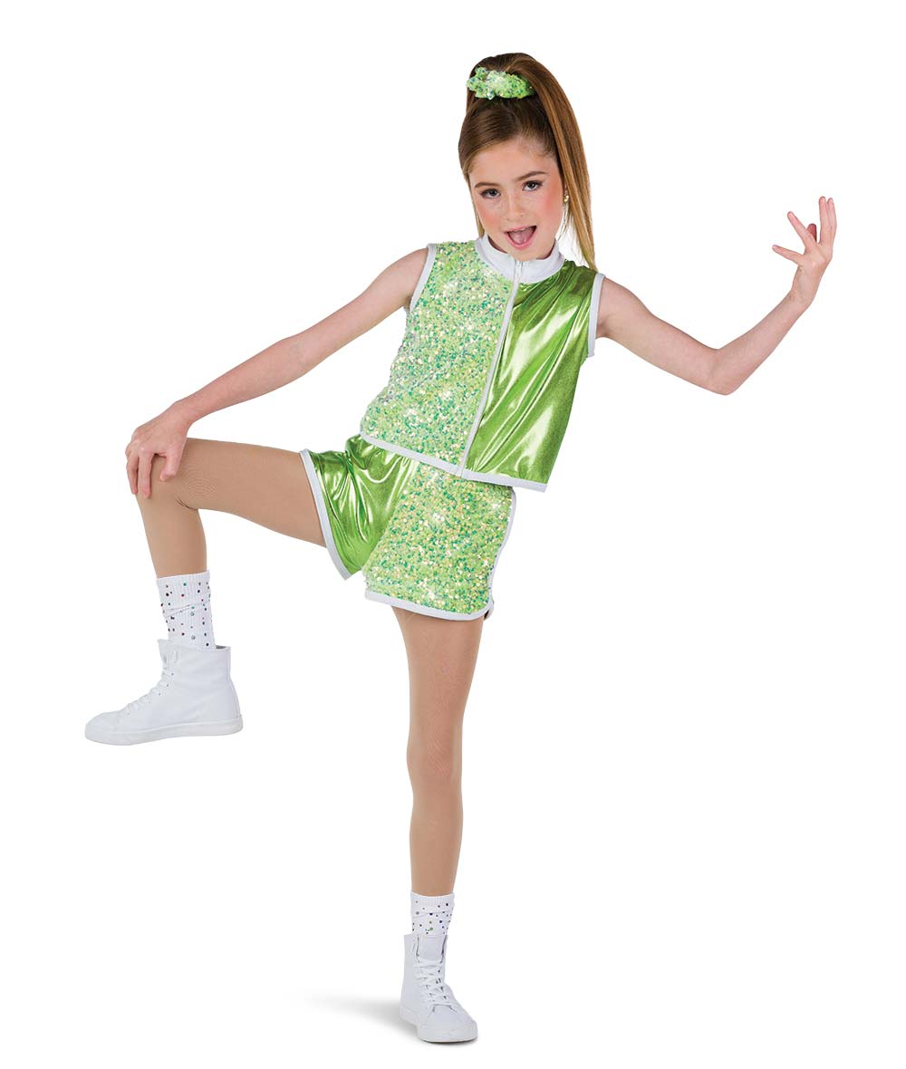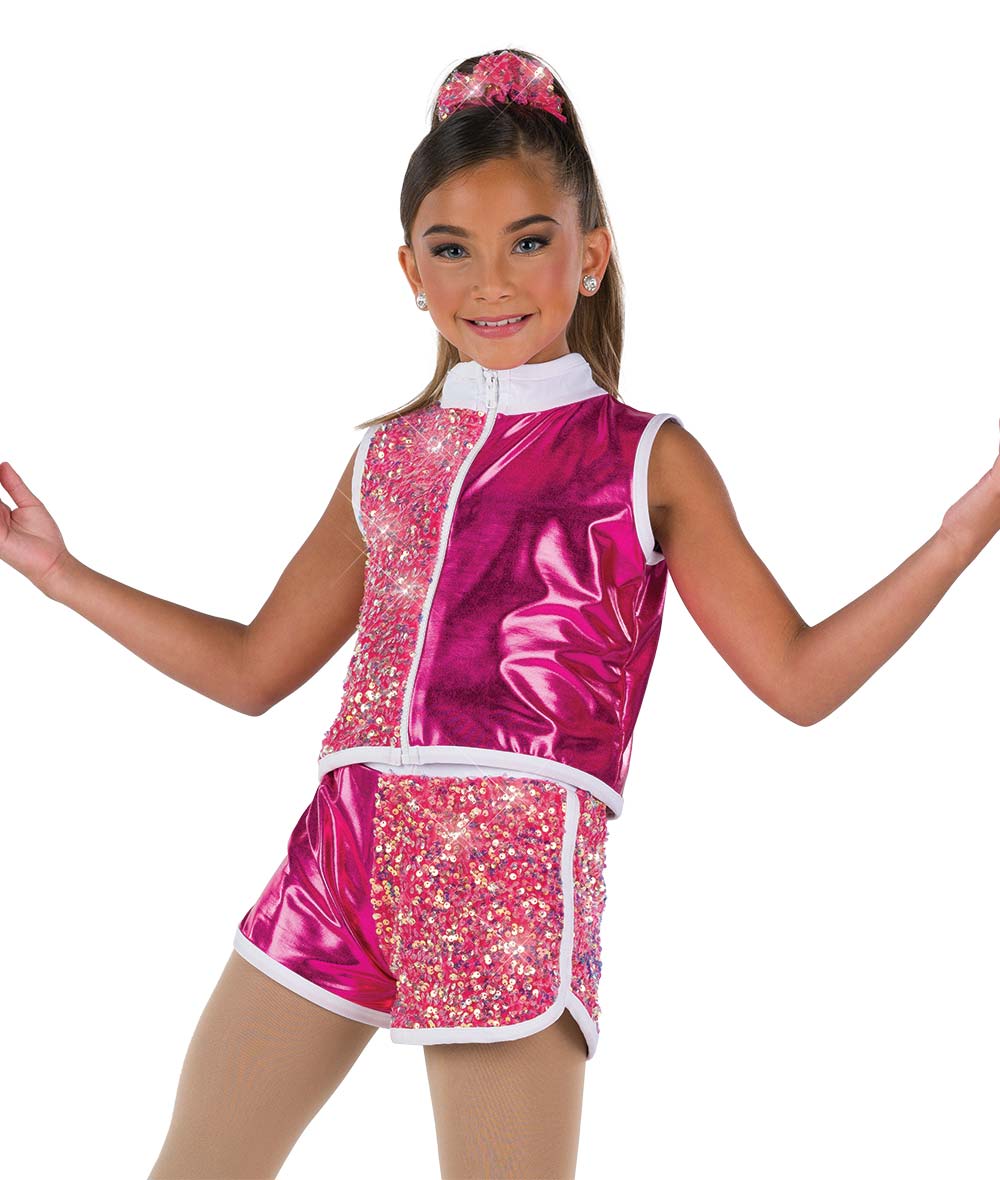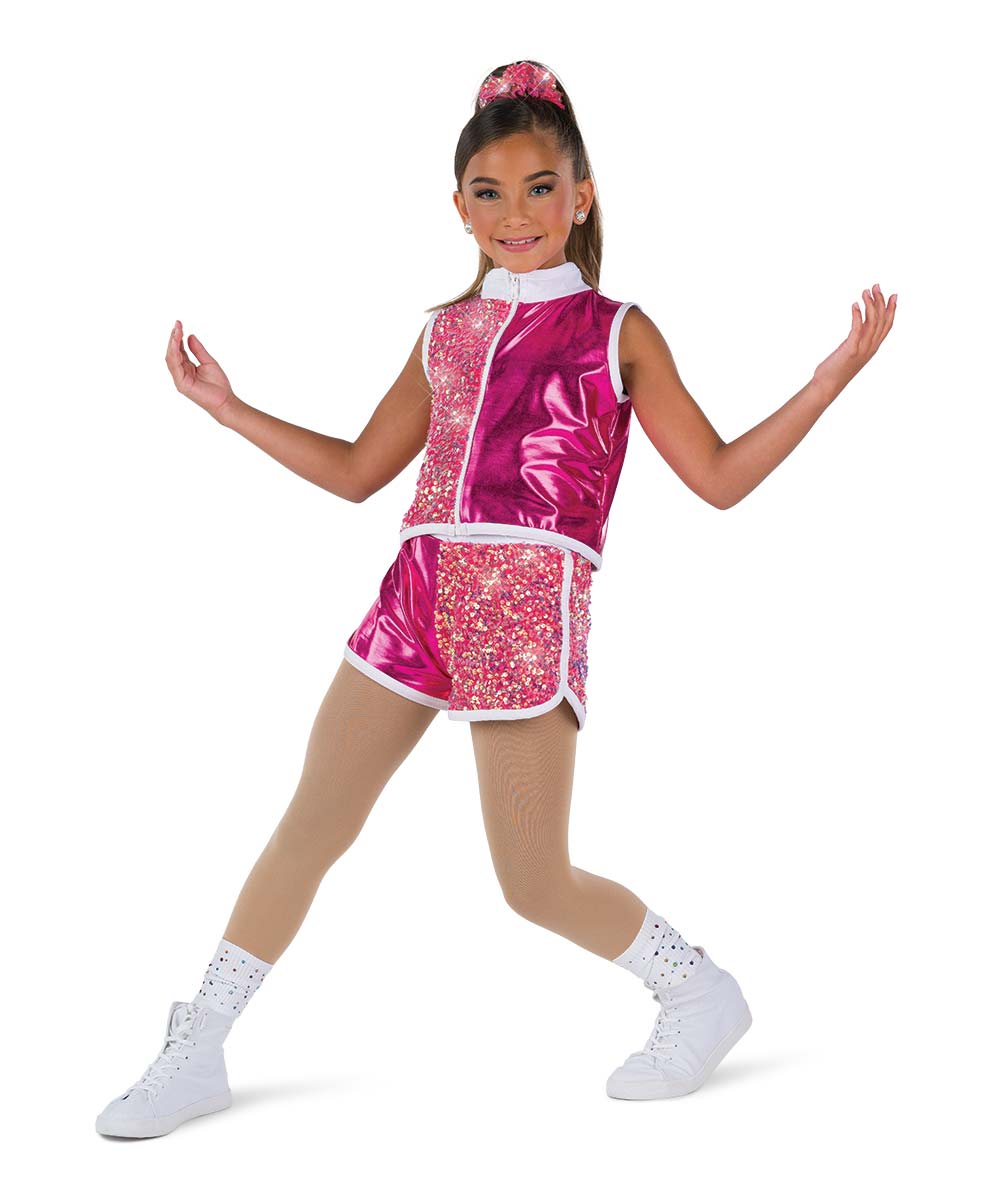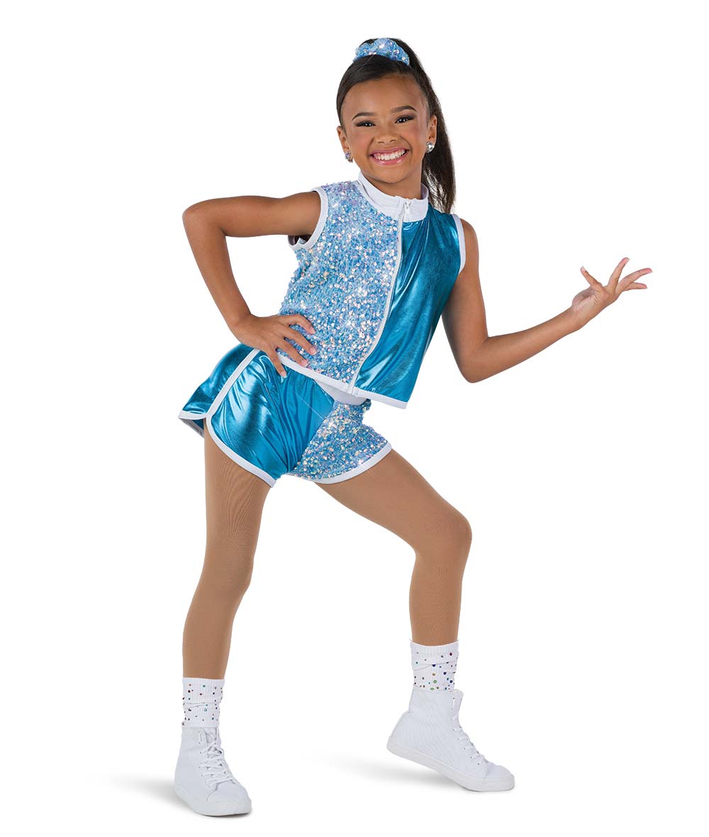 Flat foil lycra and multicolor sequin velvet tank top and shorts with spandex trim. Front zipper. Made in the USA. Comfort Seamed.
