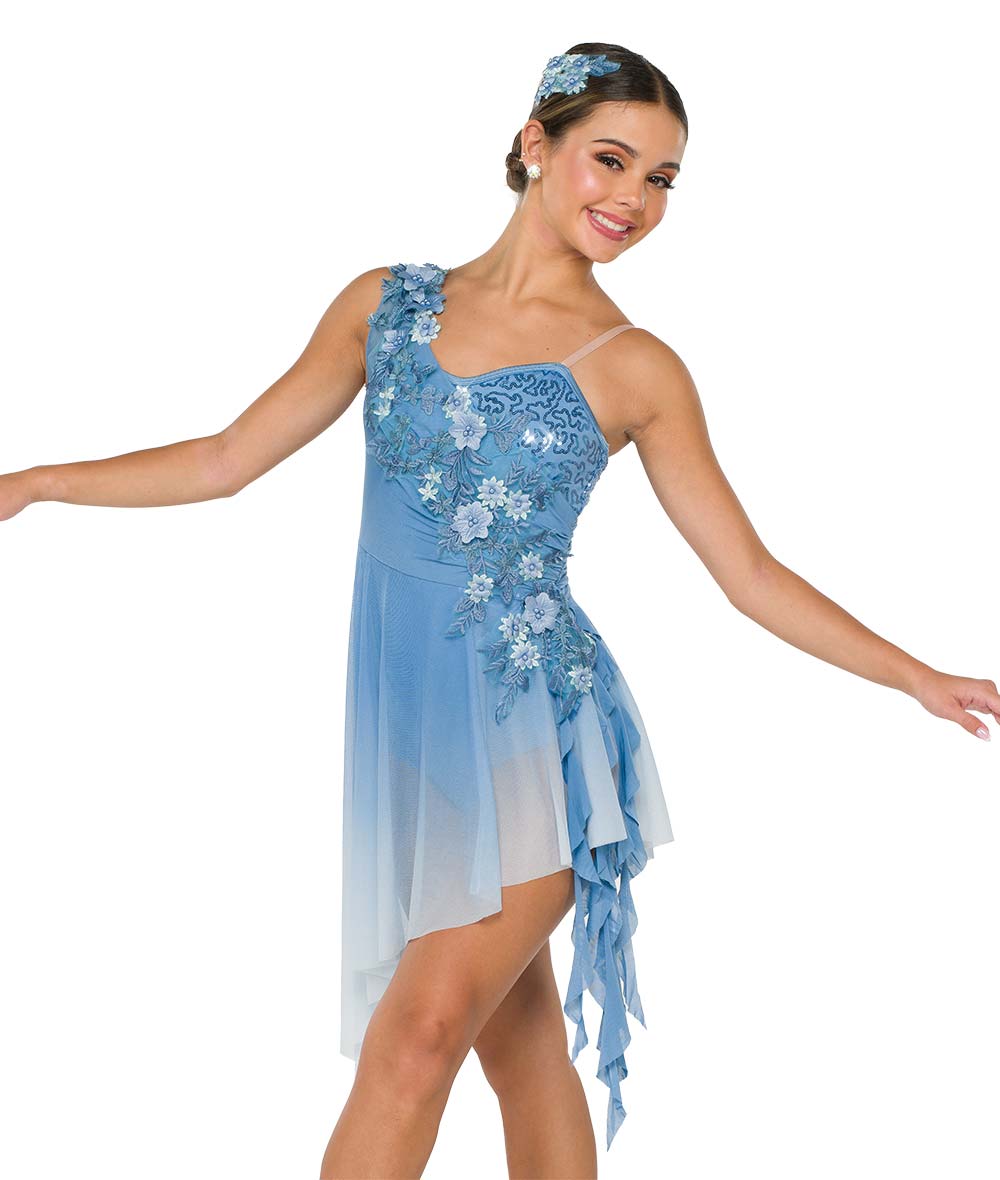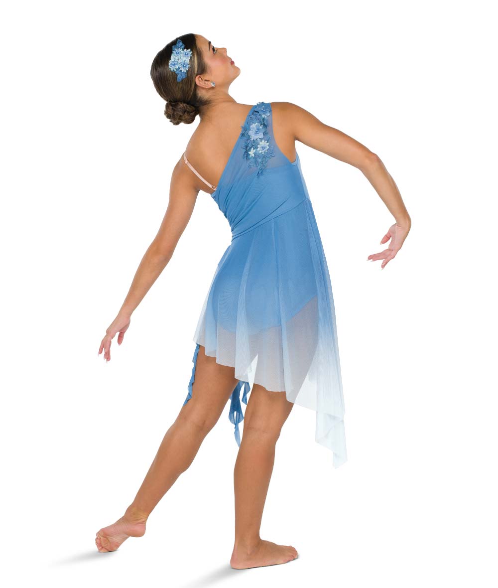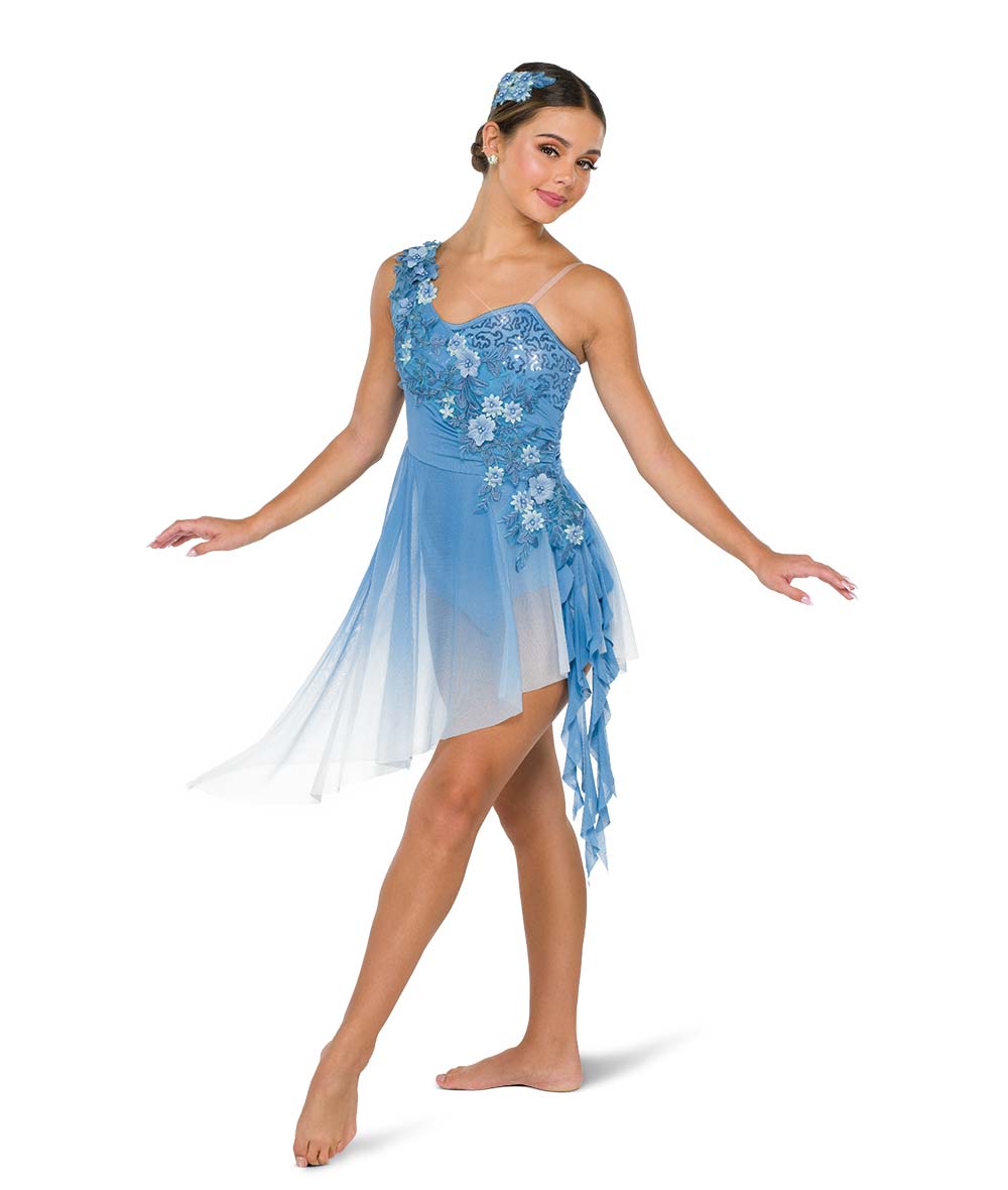 Lined sequin and solid spandex leotard with attached ombre mesh asymmetrical skirt and spiral side drapes. Attached large floral applique and tan adjustable strap. Imported.