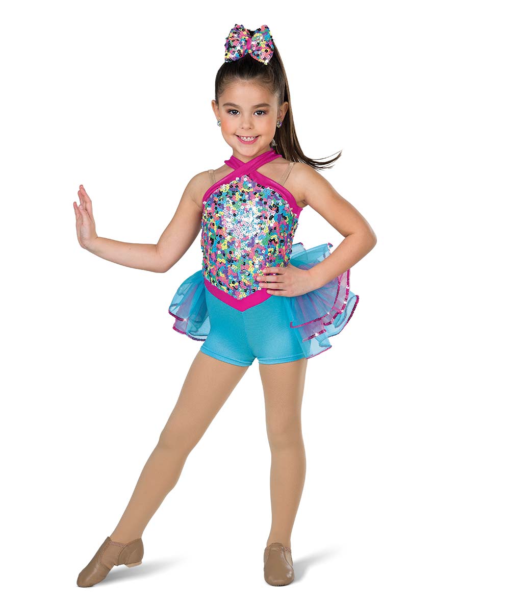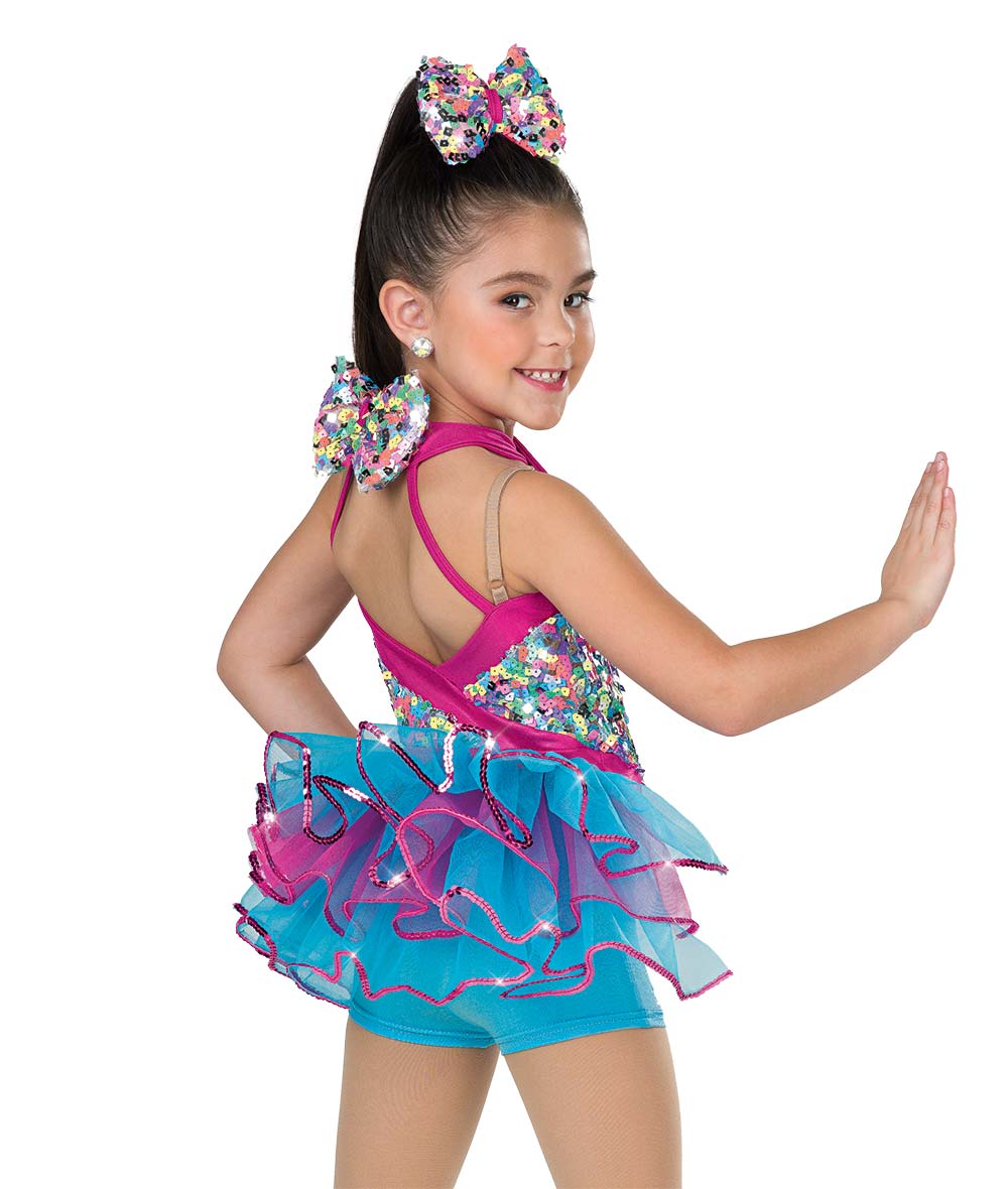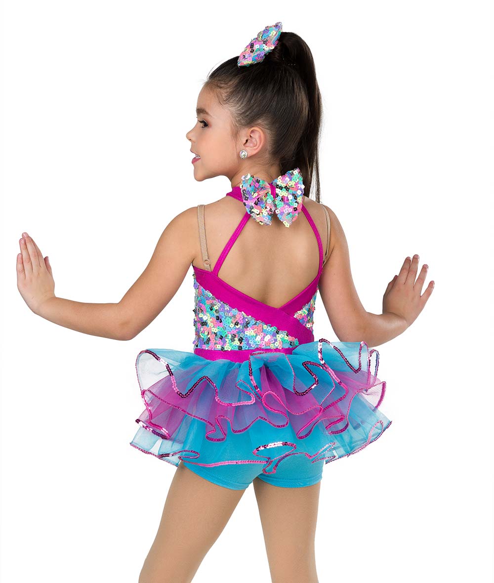 Lined rainbow sequin mesh and spandex shortall with attached bow and tan adjustable straps. Attached sequin trimmed organza back bustle. Imported.