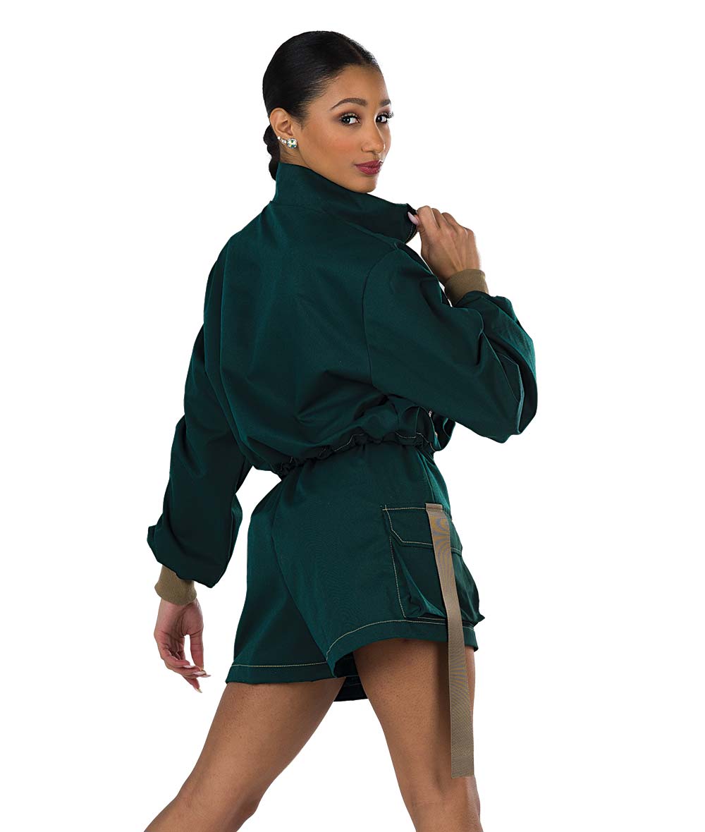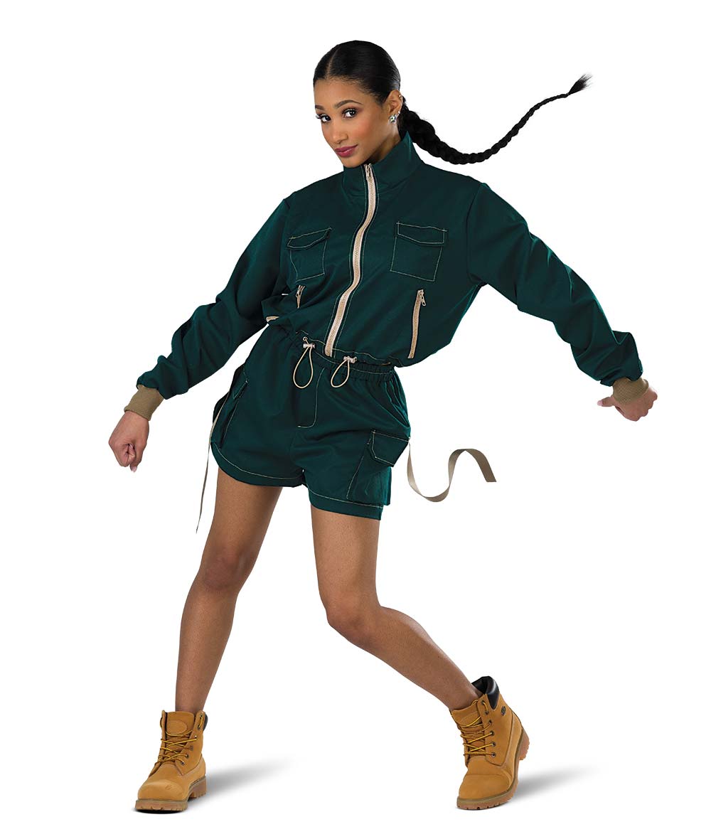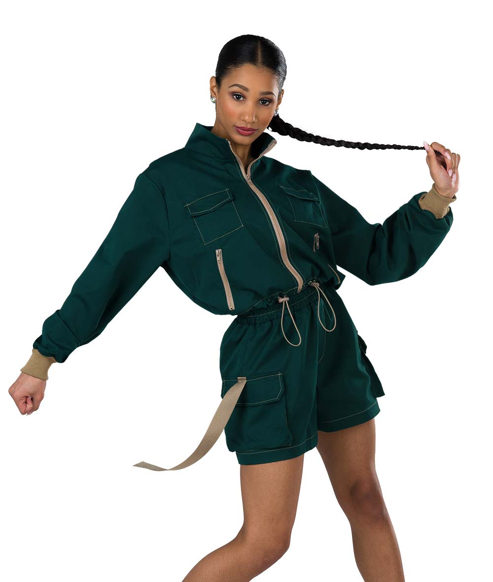 Stretch twill crop jacket with zipper front and elastic cinched waist. Stretch twill cargo shorts with faux straps. Imported.