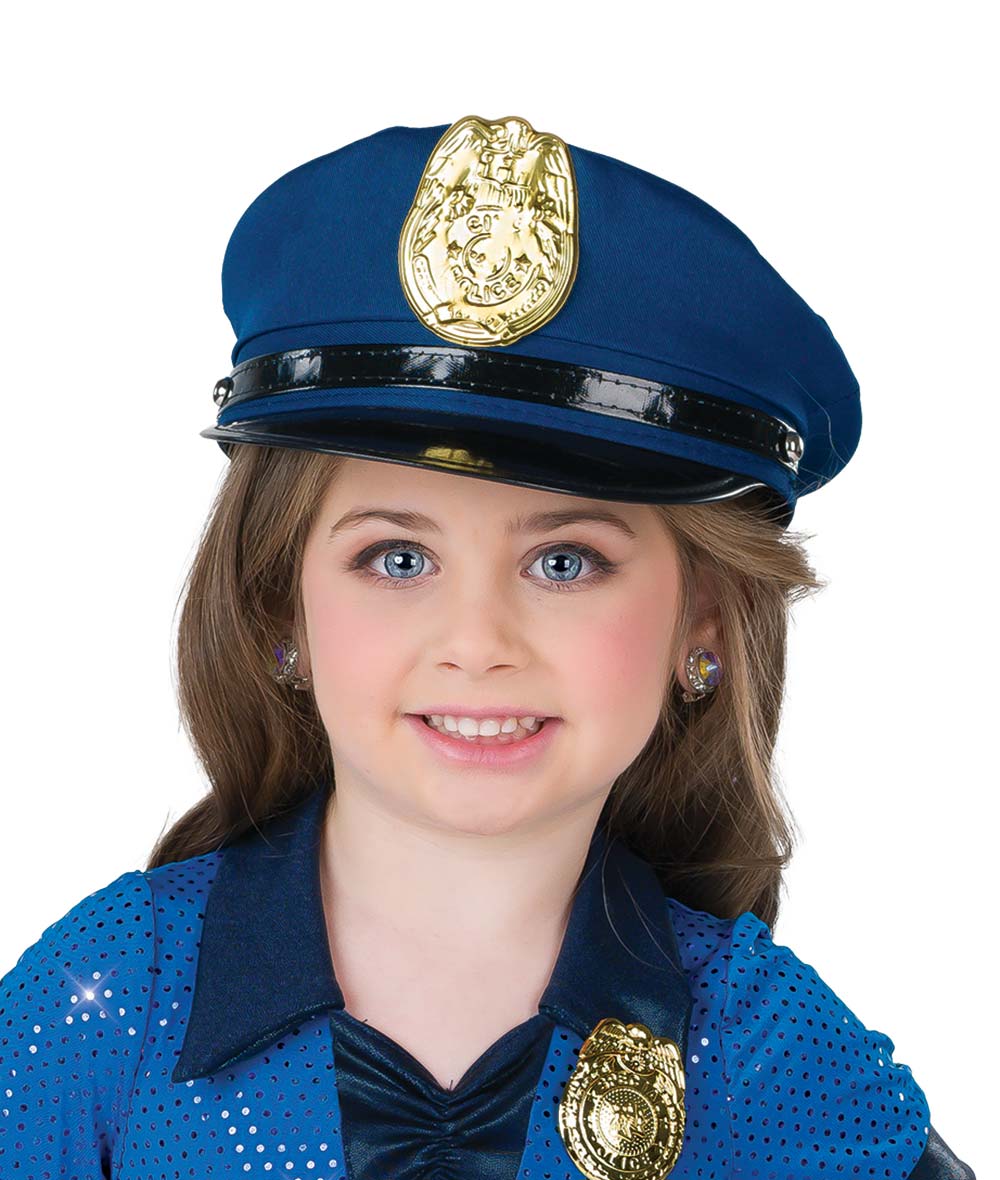 Blue police hat with attached badge. Imported.