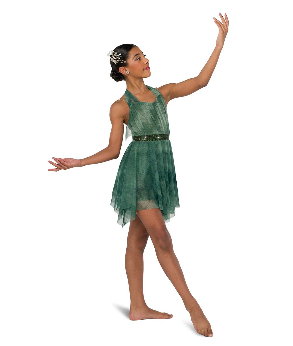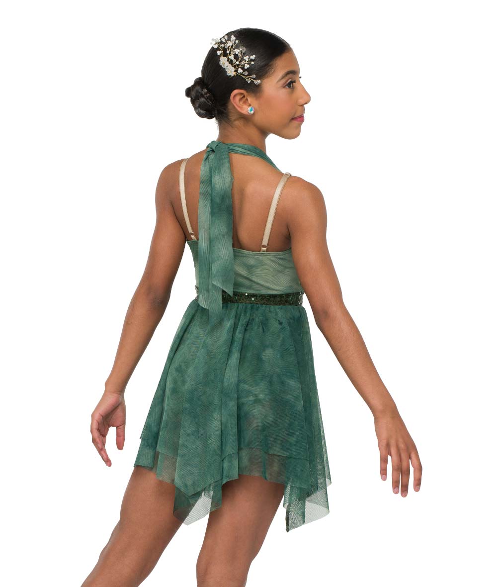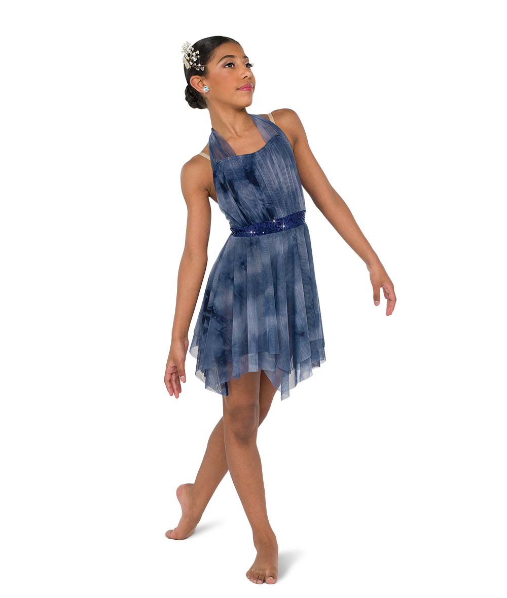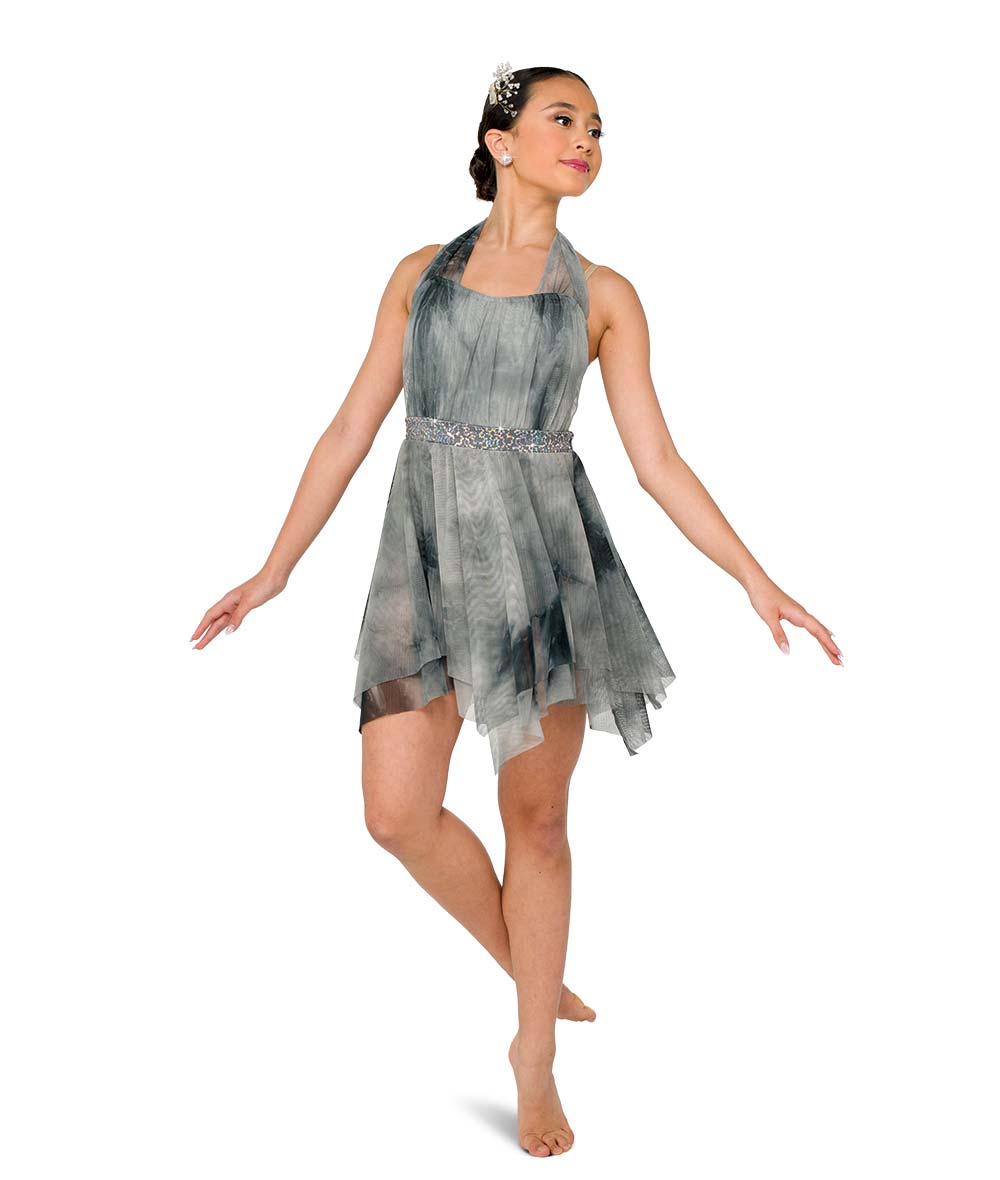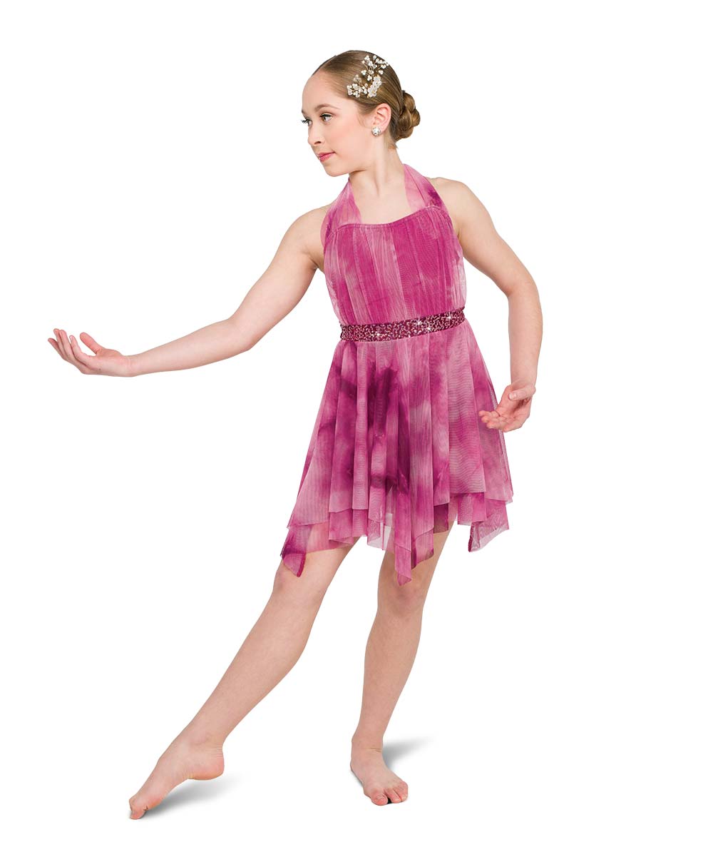 Tie-dye mesh dress with sequin spandex waistband over attached spandex leotard. Made in the USA.
