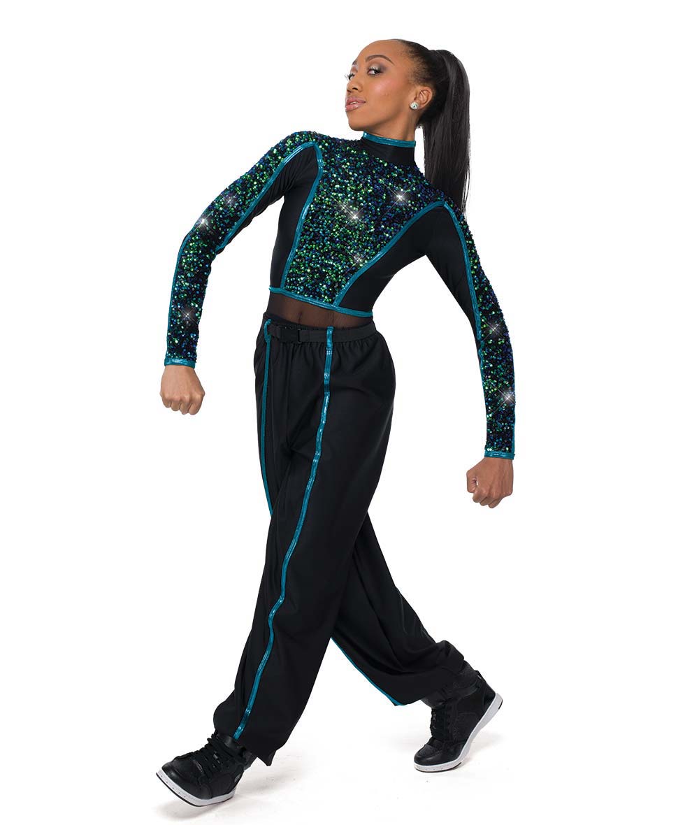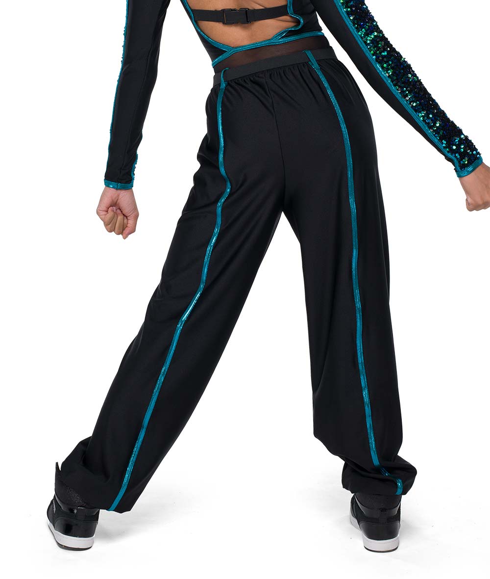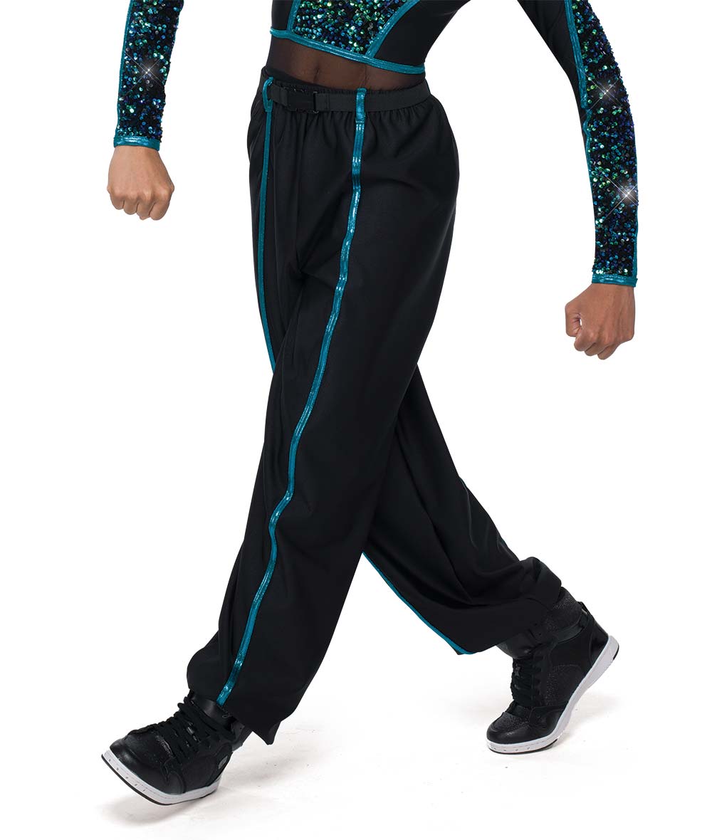 Stretch satin joggers with foil lycra trim and elastic belt with buckle. Made in the USA.