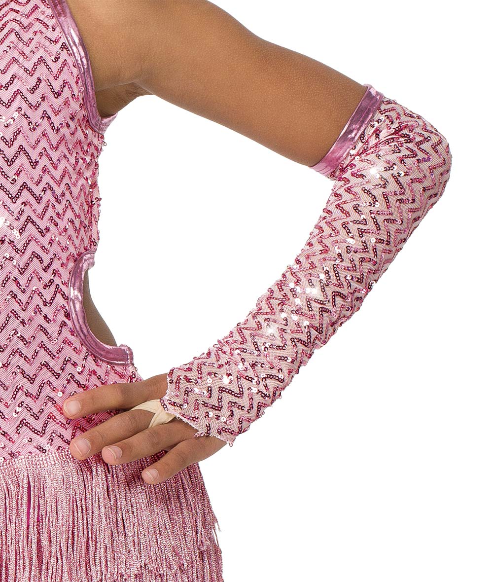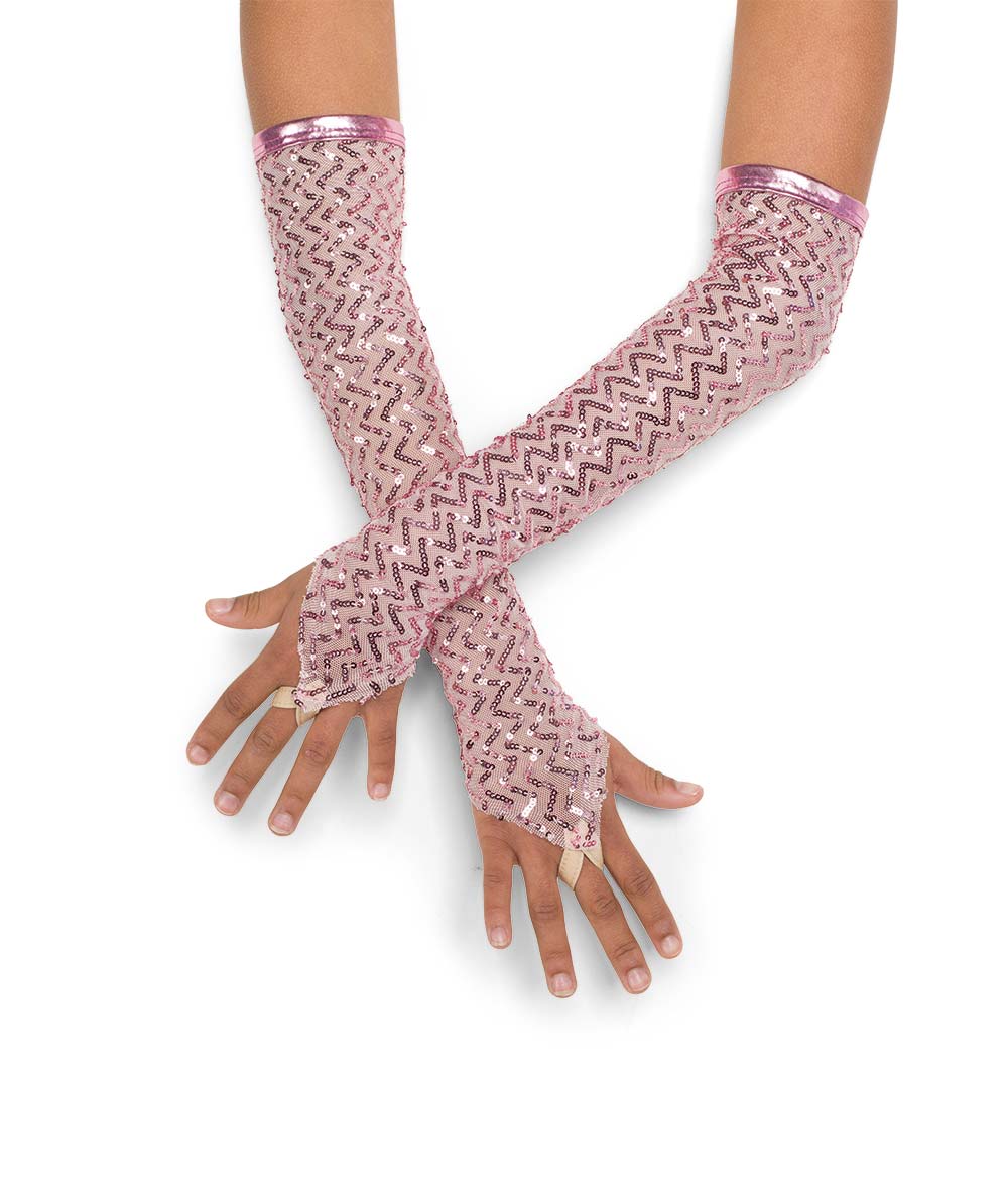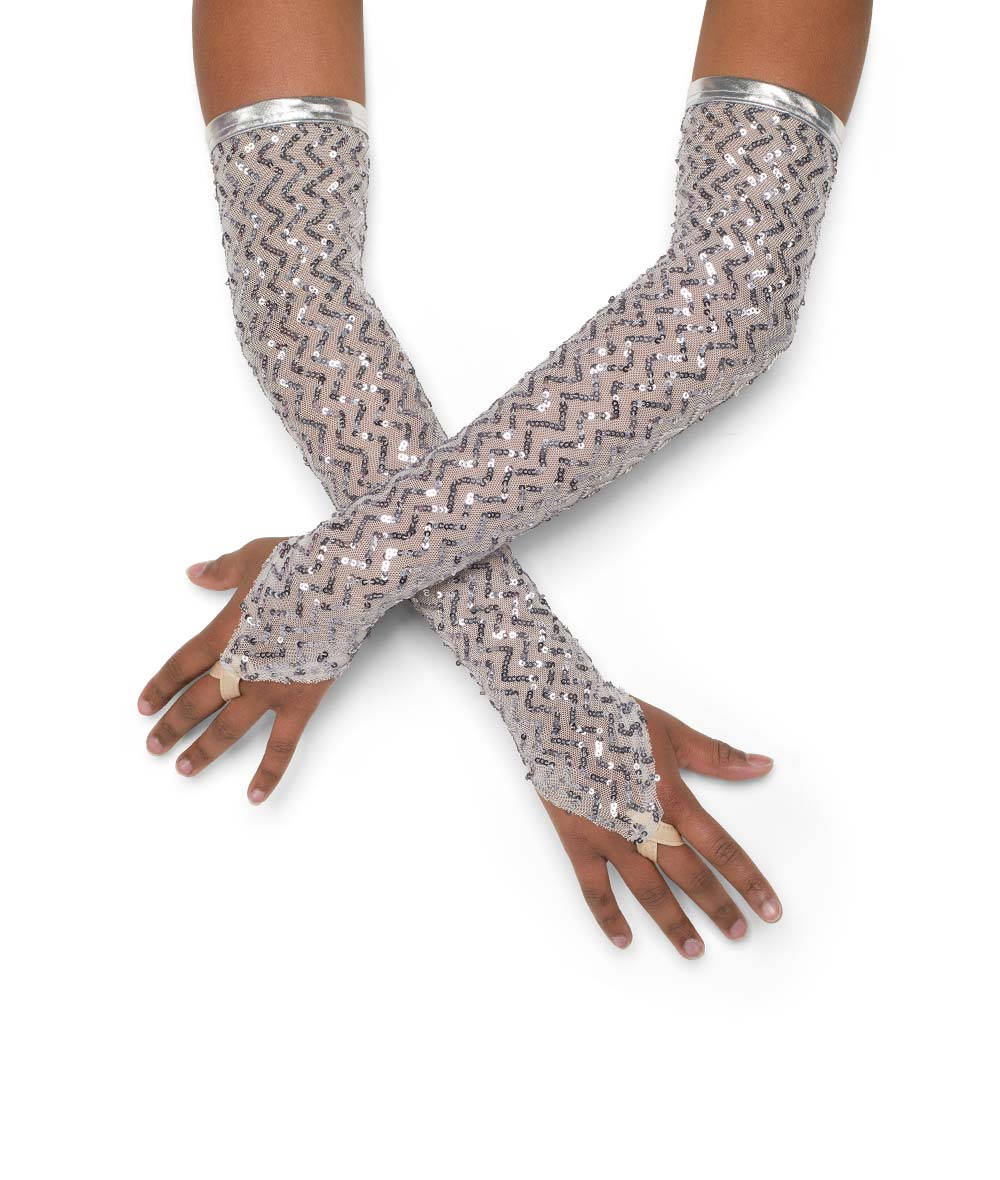 Zigzag sequin mesh over-the-elbow mitts with elastic finger loop. Made in the USA.
