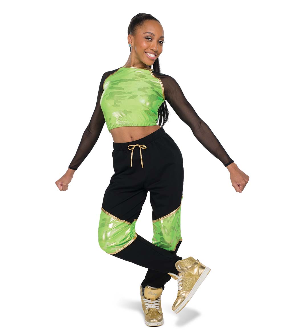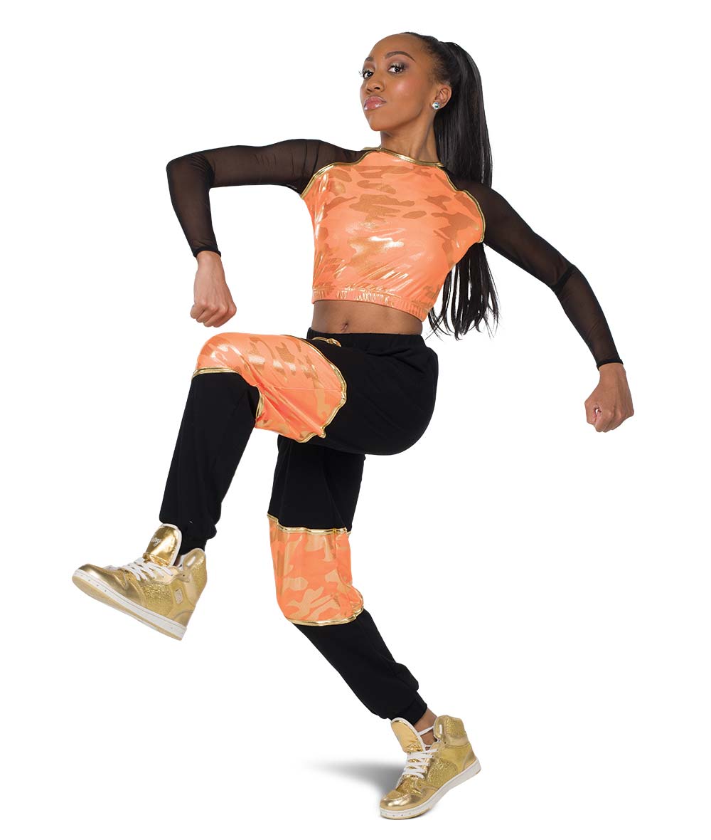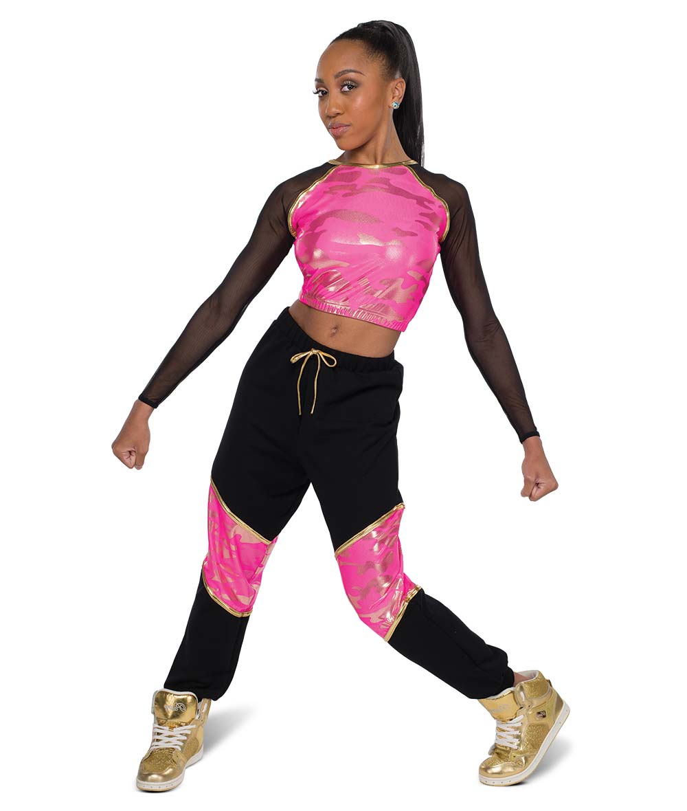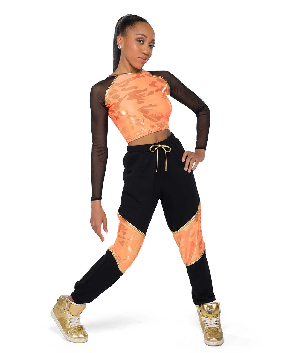 Foil camo print spandex and mesh long sleeve crop top with flat foil lycra trim. French terry joggers with foil camo print spandex insets and flat foil lycra trim. Made in the USA.