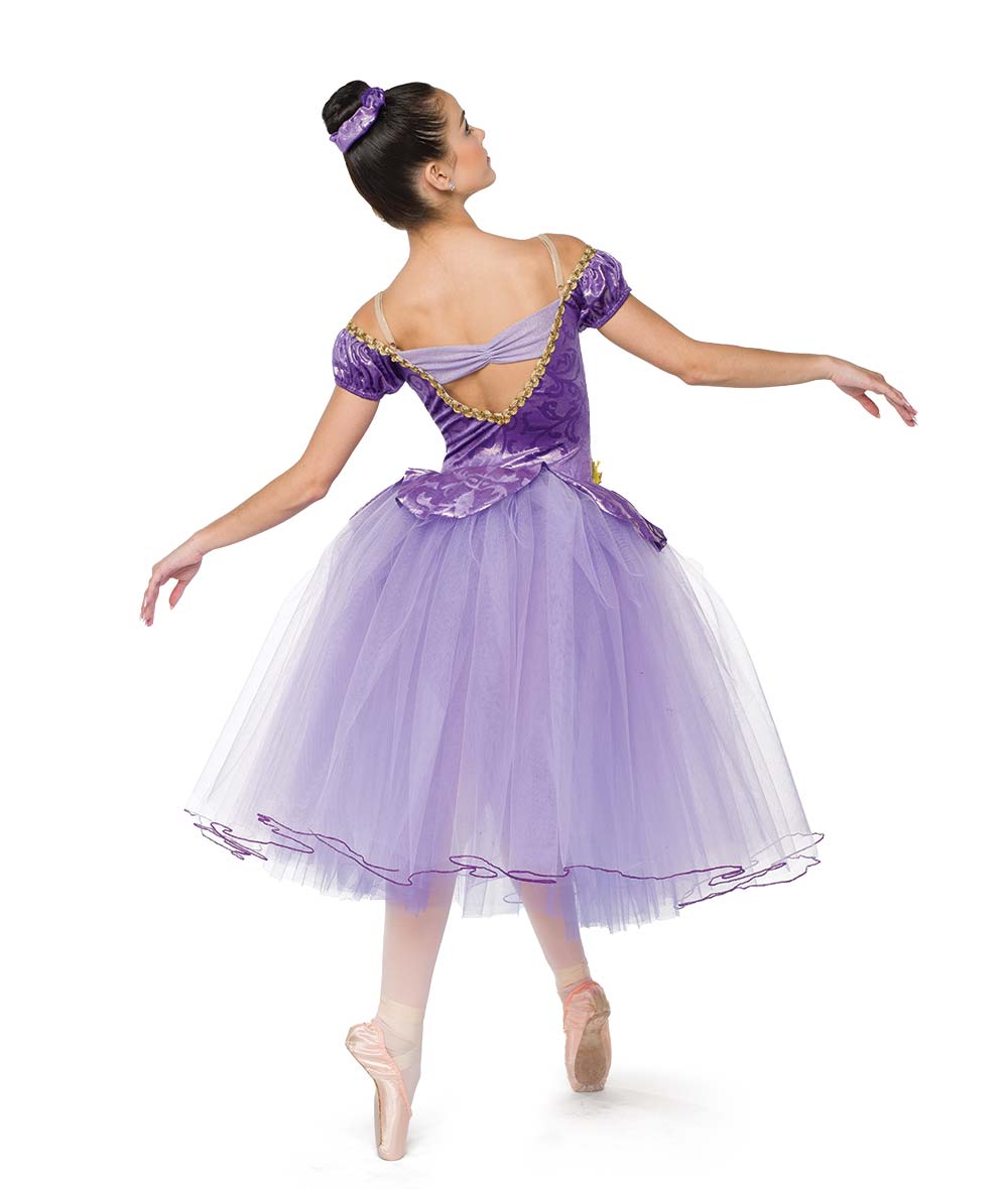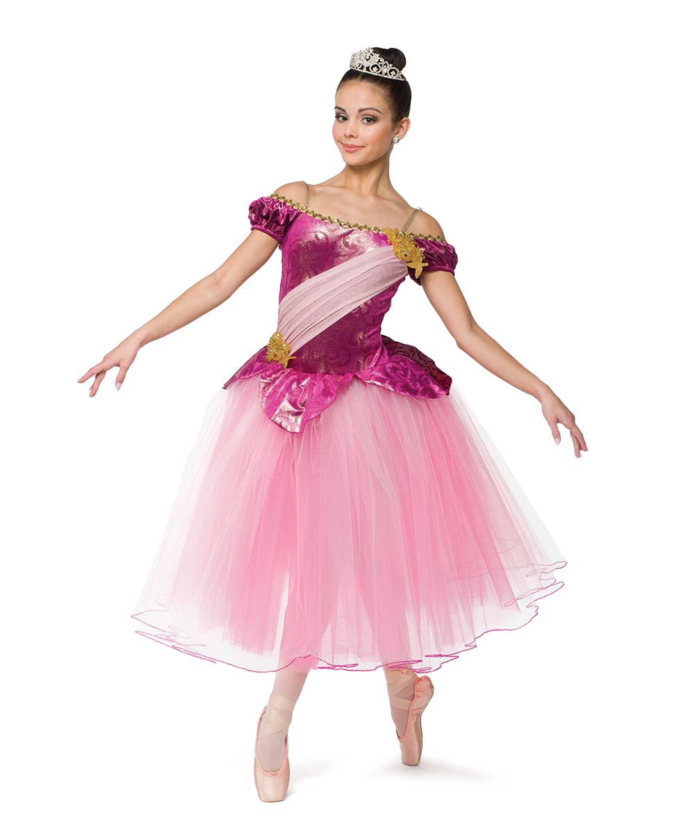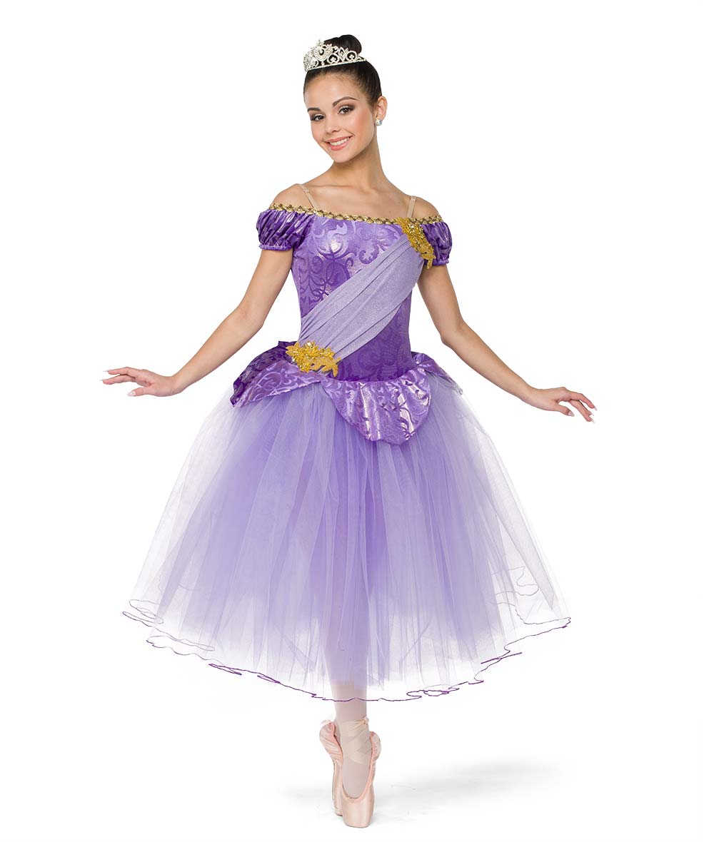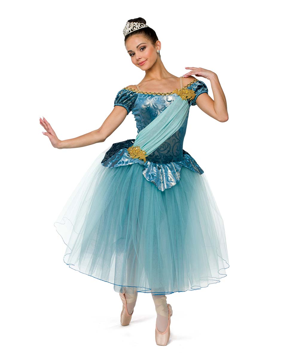 Foil scroll velvet bodice with glitter mesh sash with attached sequin trim and appliques. Attached lettuce edge tulle tutu over spandex leotard. Attached tan adjustable straps. Tiara sold separately. Made in the USA.
