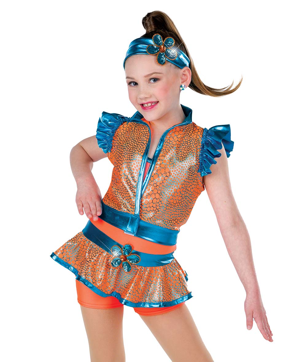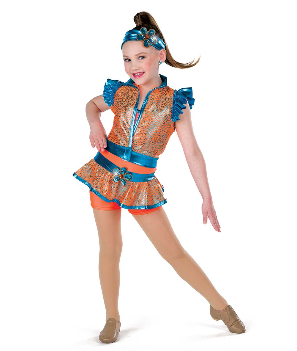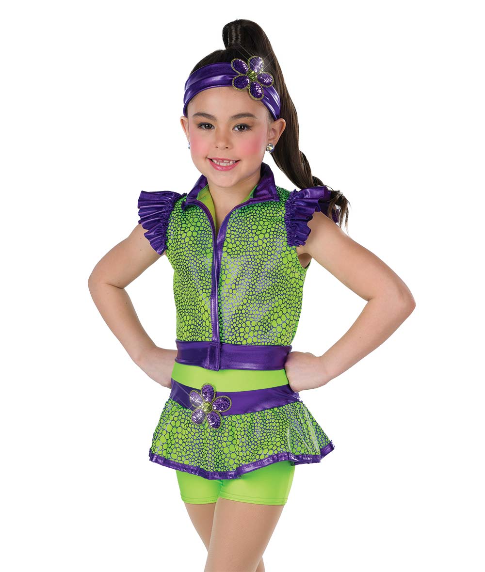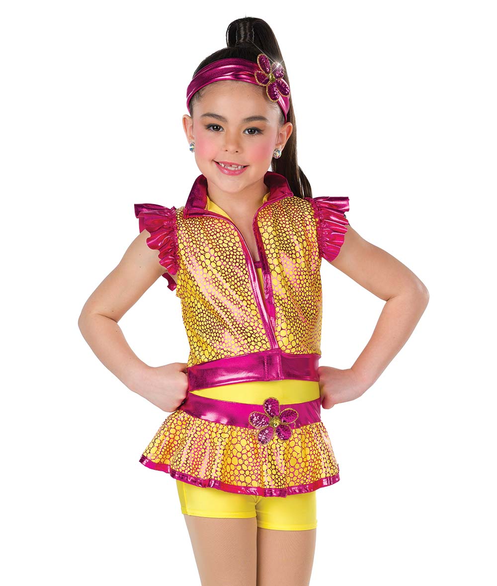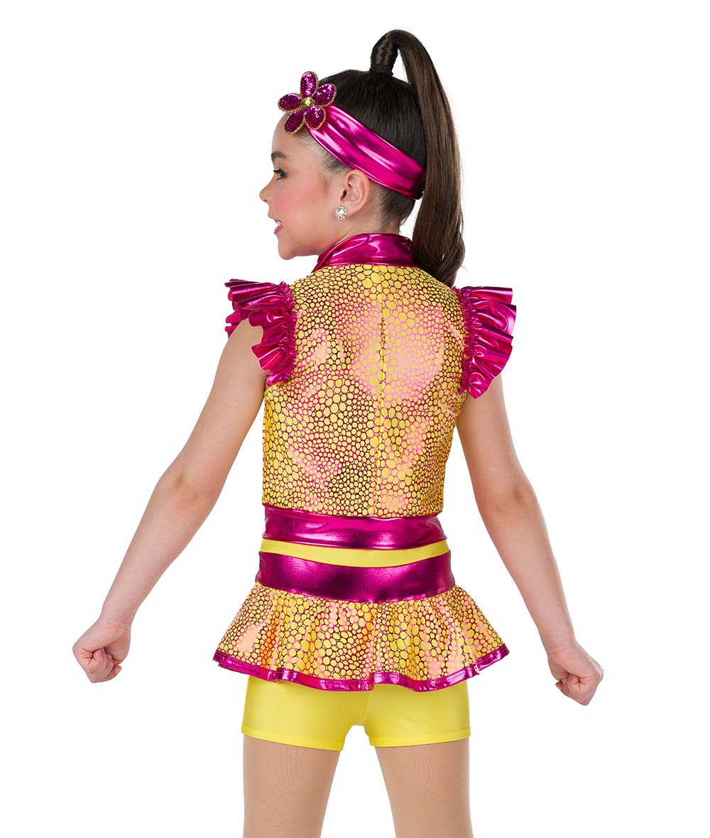 Foil bubble pattern and solid spandex skirted shortall with flat foil lycra trim and attached sequin flower. Foil bubble pattern spandex and flat foil lycra vest with ruffle sleeves and velcro closure. Made in the USA.