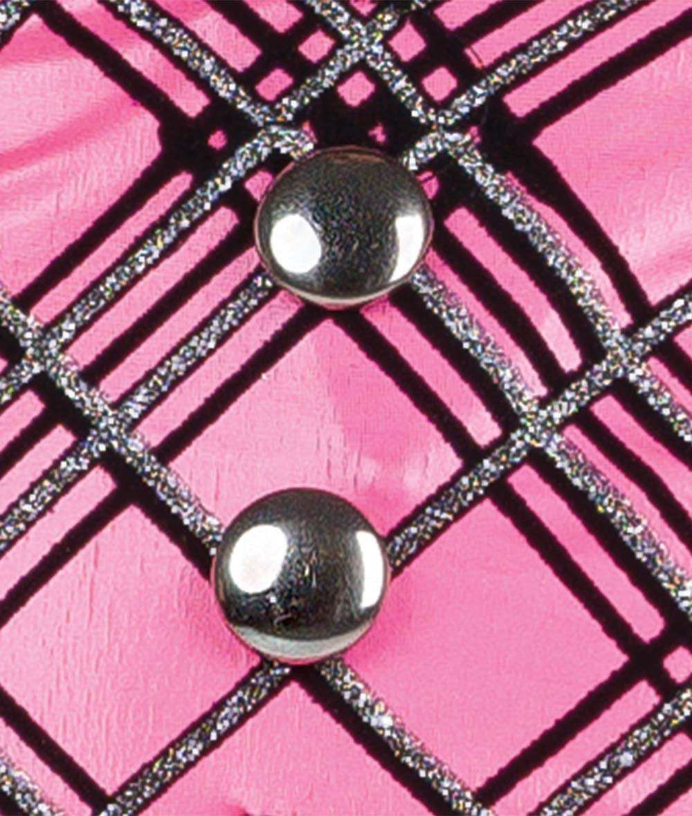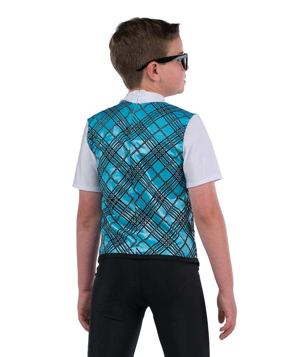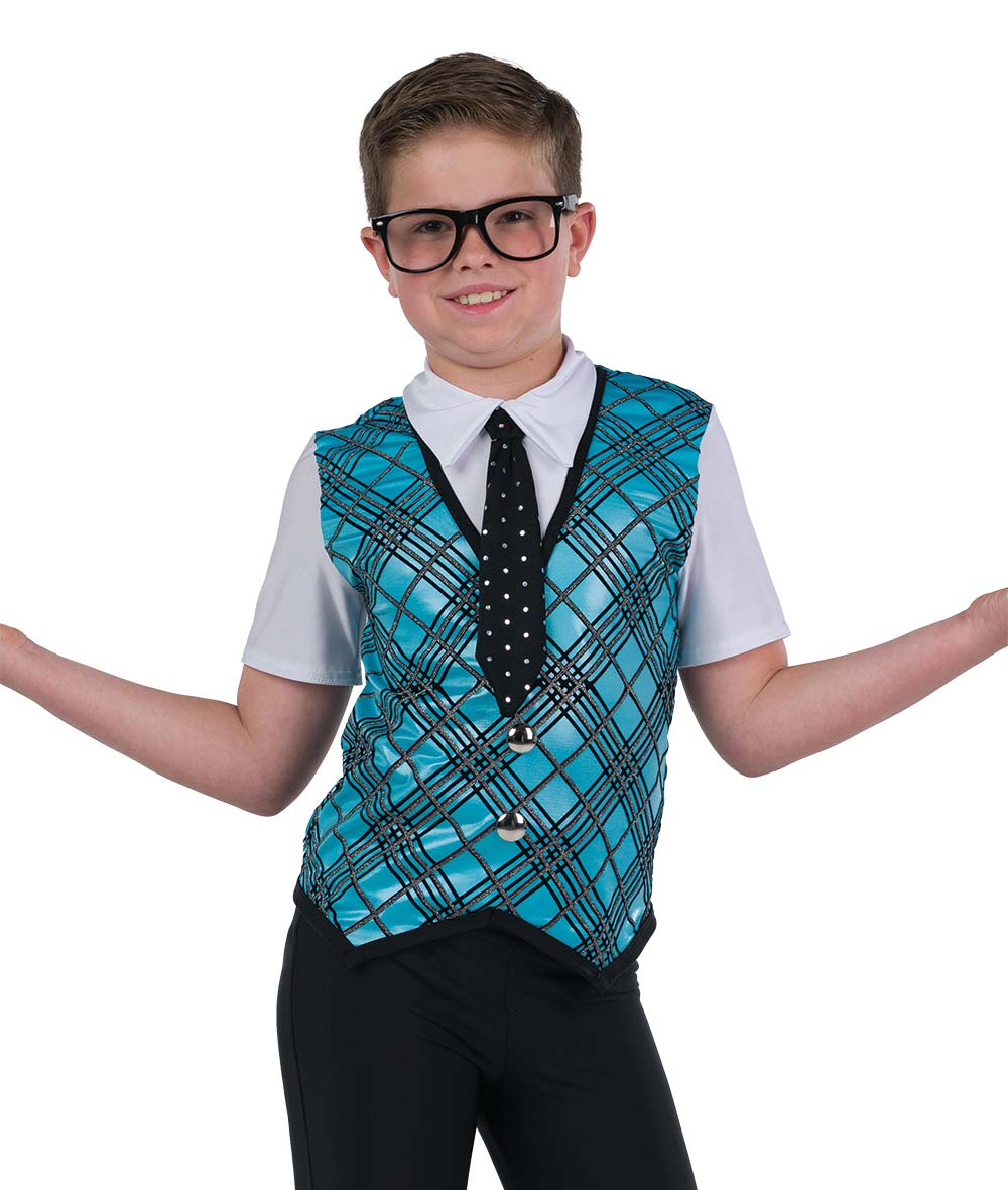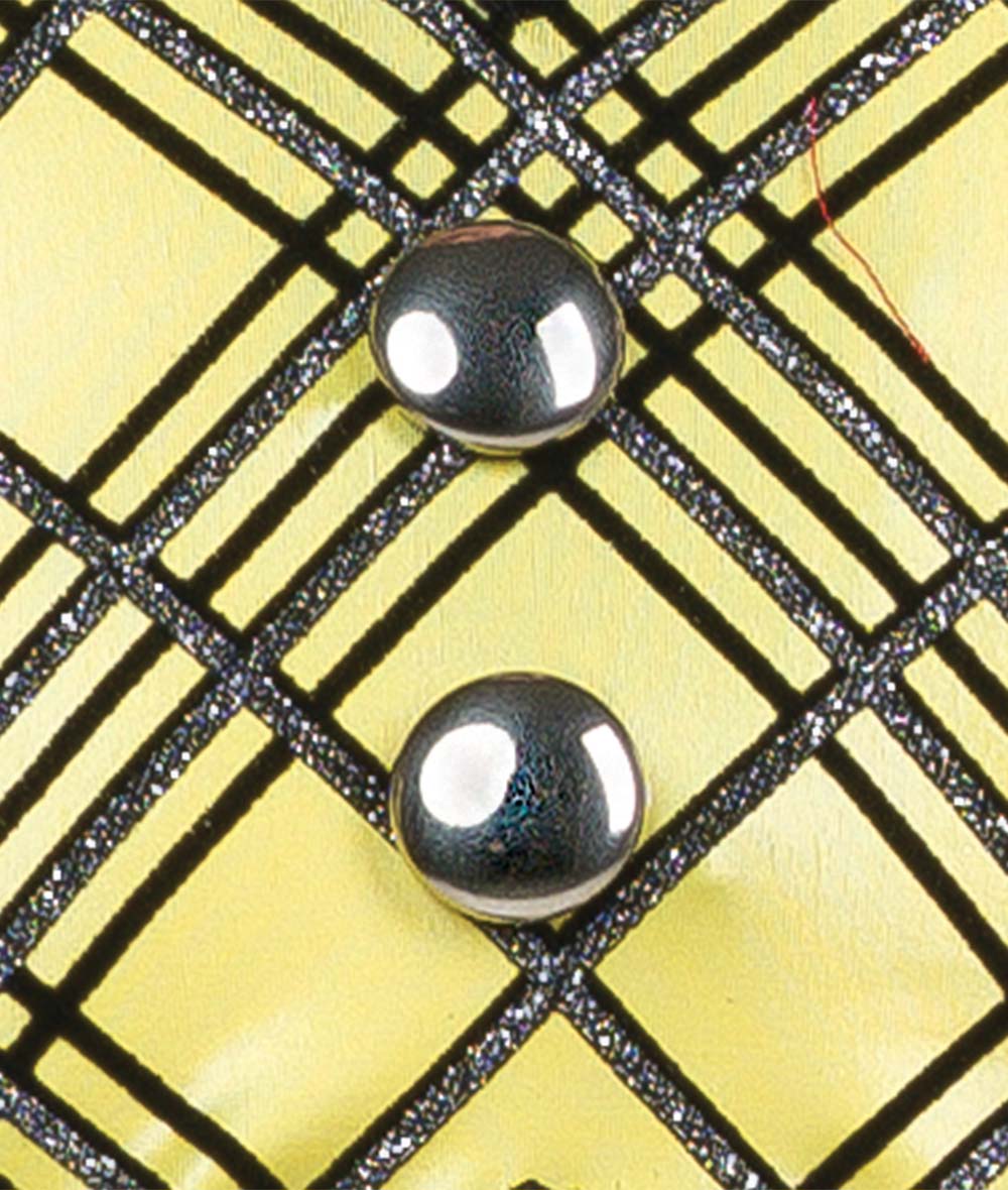 Flocked foil striped stretch vinyl and spandex collared shirt with attached rhinestone dot spandex tie and tack buttons. Pants sold separately. Made in the USA.