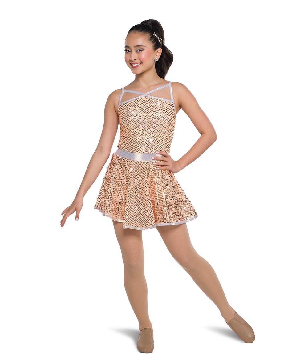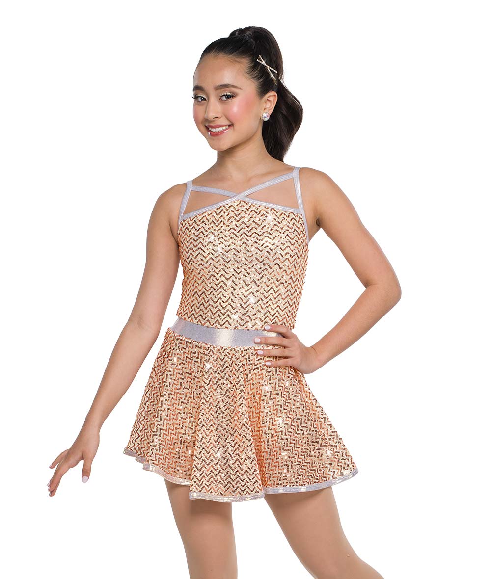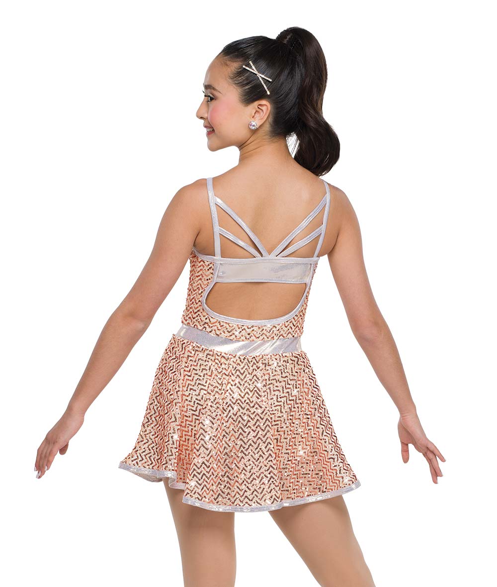 Lined zigzag sequin mesh and foil lycra dress over attached leotard. Made in the USA.