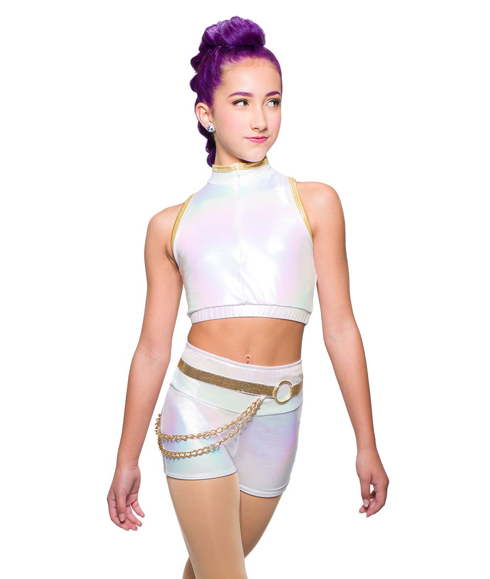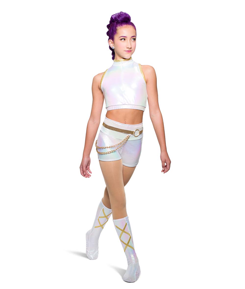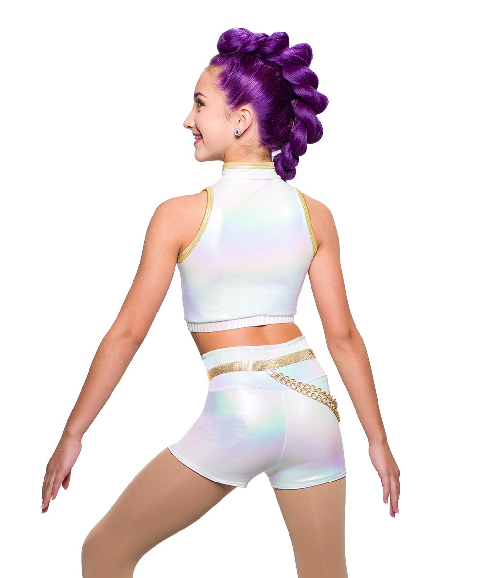 Hologram foil lycra top and hot pants with foil lycra trim and gold chains. Zipper closure on top. Jacket and boot covers sold separately. Made in the USA.