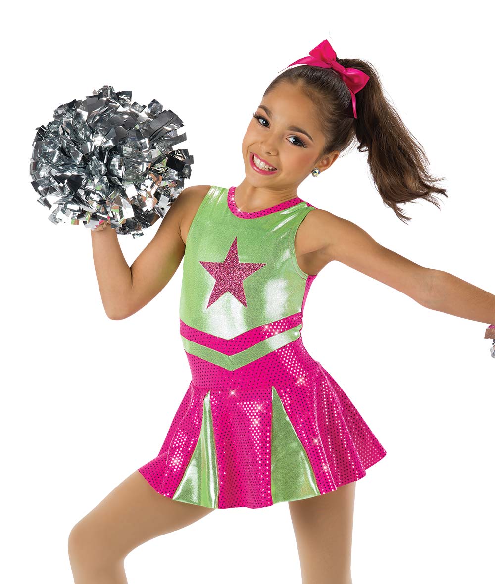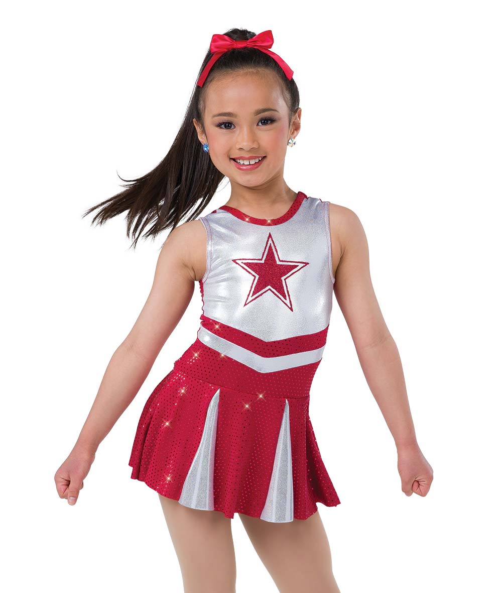Foil and sequin dot lycra leotard with glitter star applique and attached skirt. Made in the USA.
