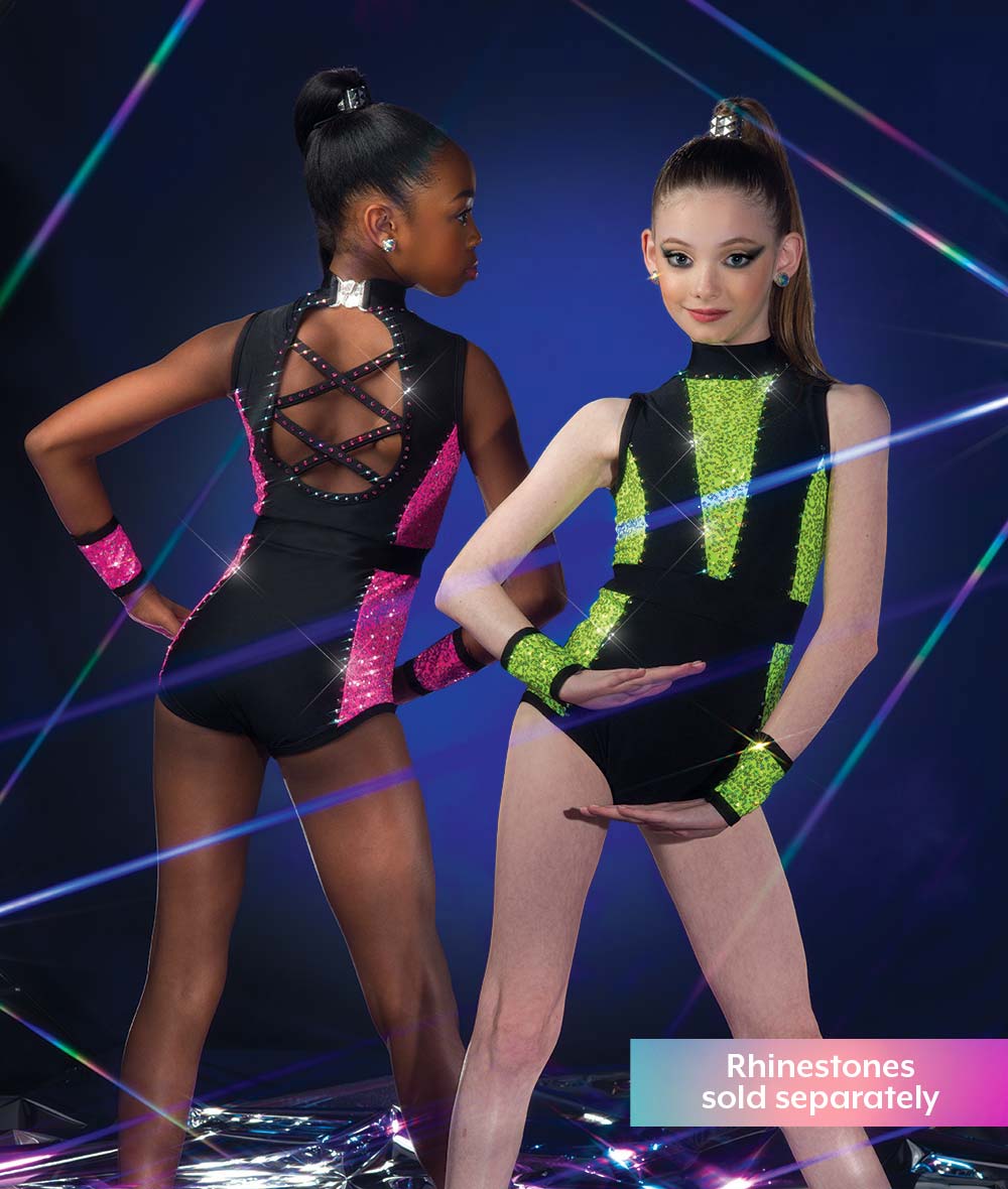 Lined sequin and solid spandex color blocked leotard with twirl panty. Made in the USA.