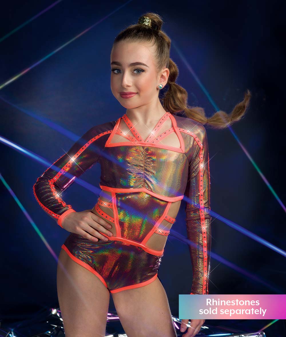 Hologram slinky long sleeve leotard with spandex trim. Cutout midriff and twirl panty. Made in the USA.