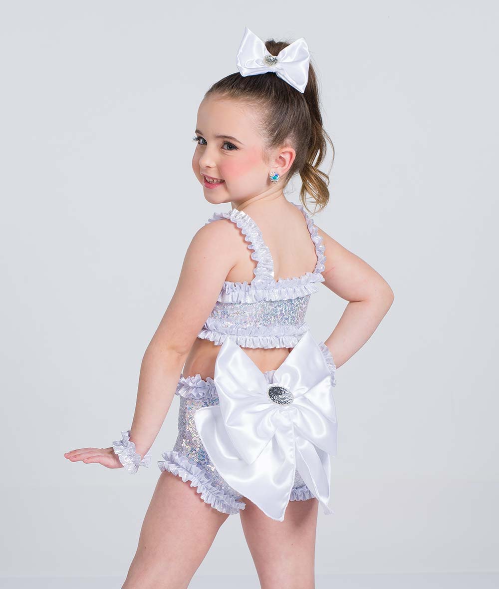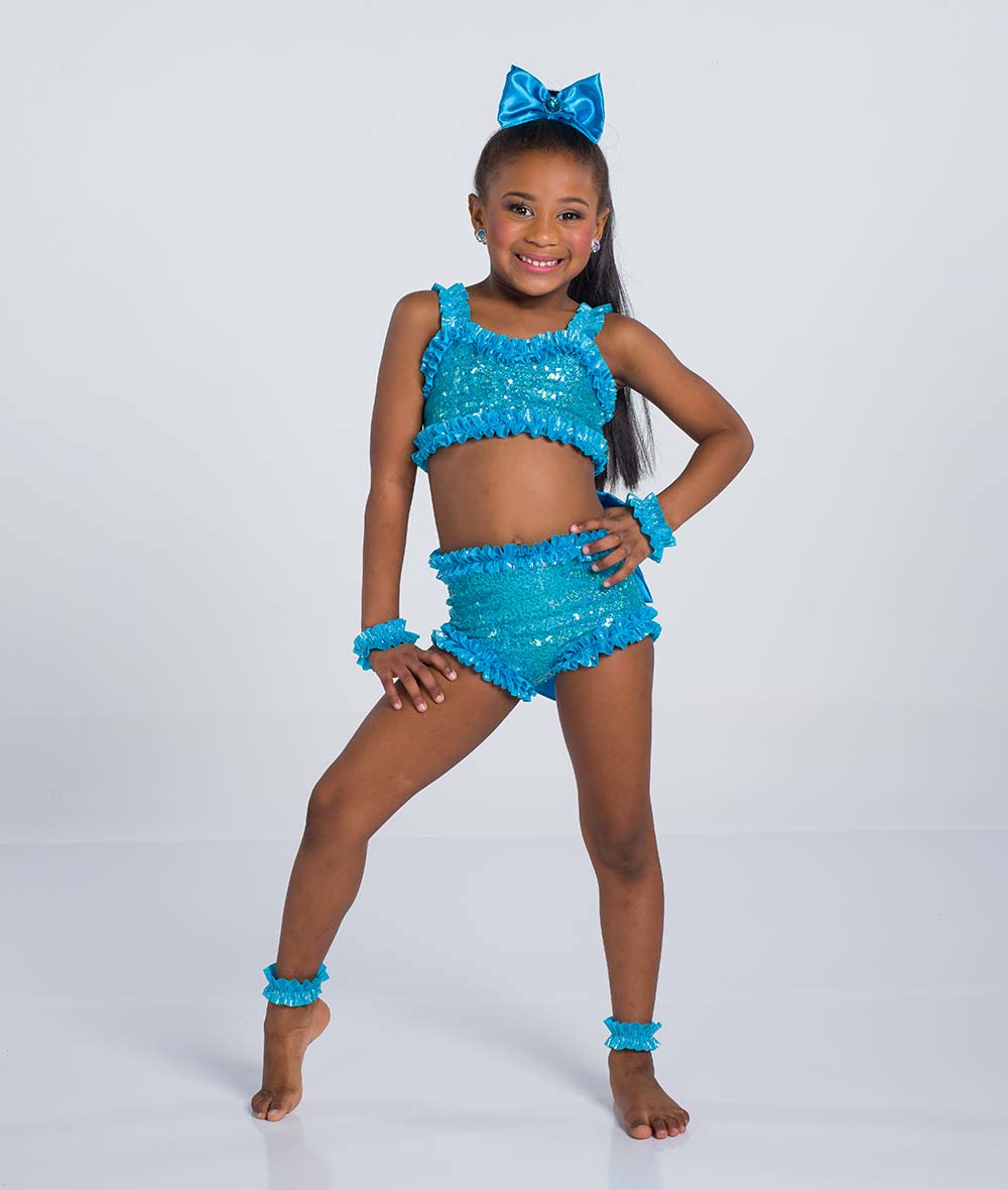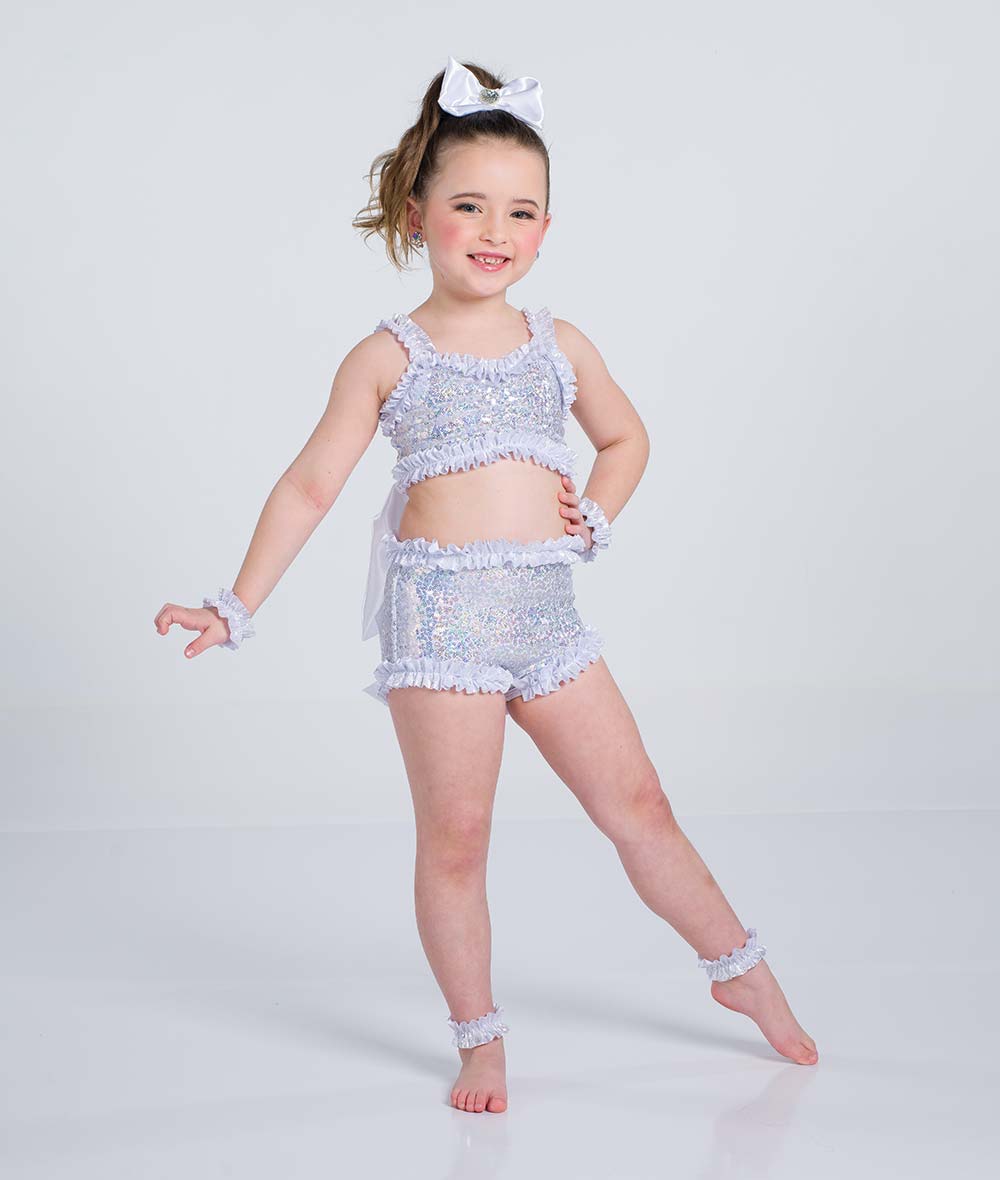 Lined elite sequin mesh bra top and twirl panty with foil lycra ruffle trim. Removable satin back bow and sequin applique on bar pins. Made in the USA.
