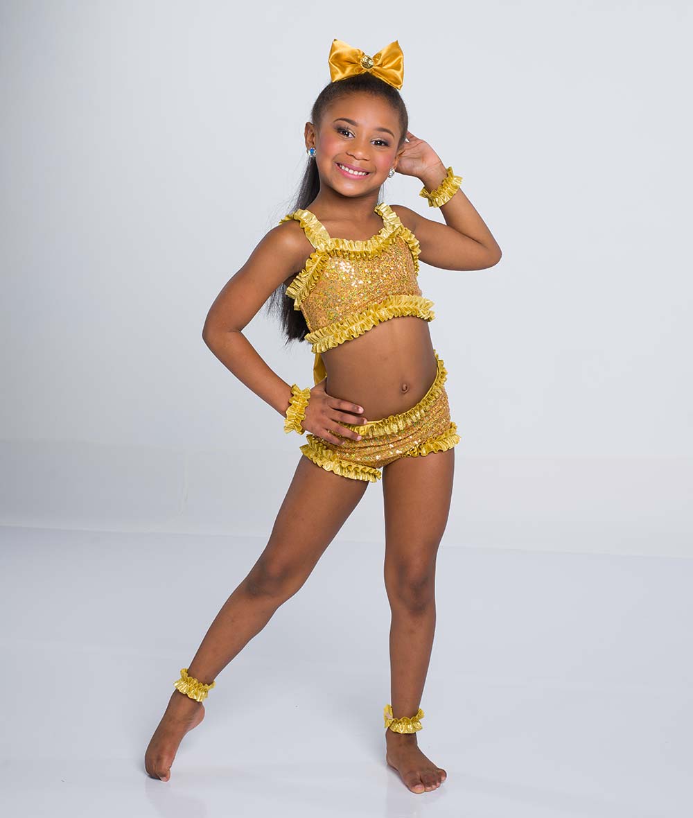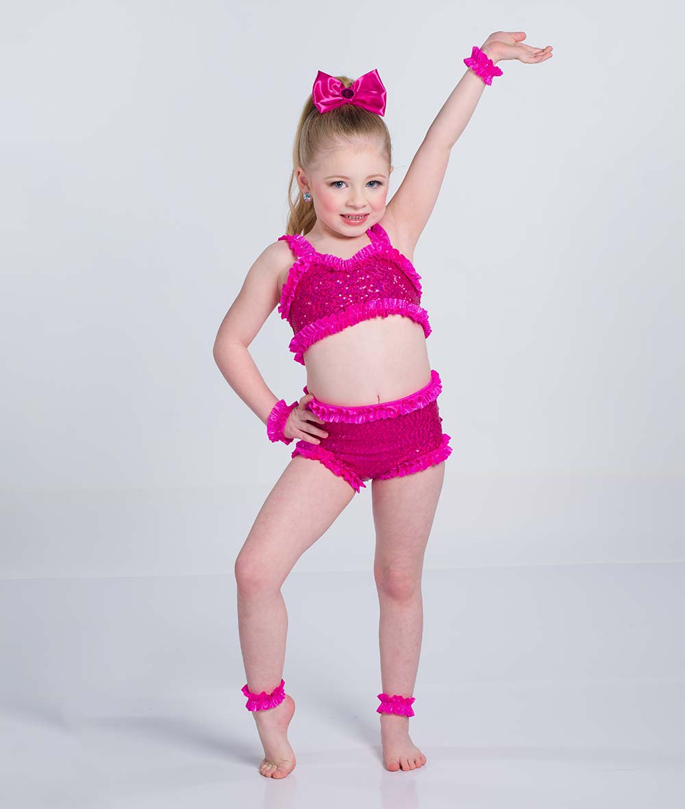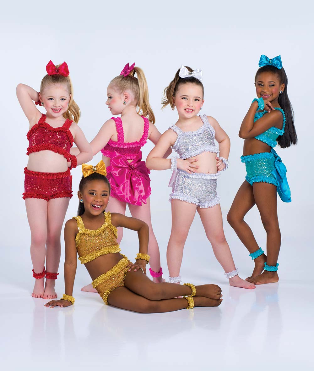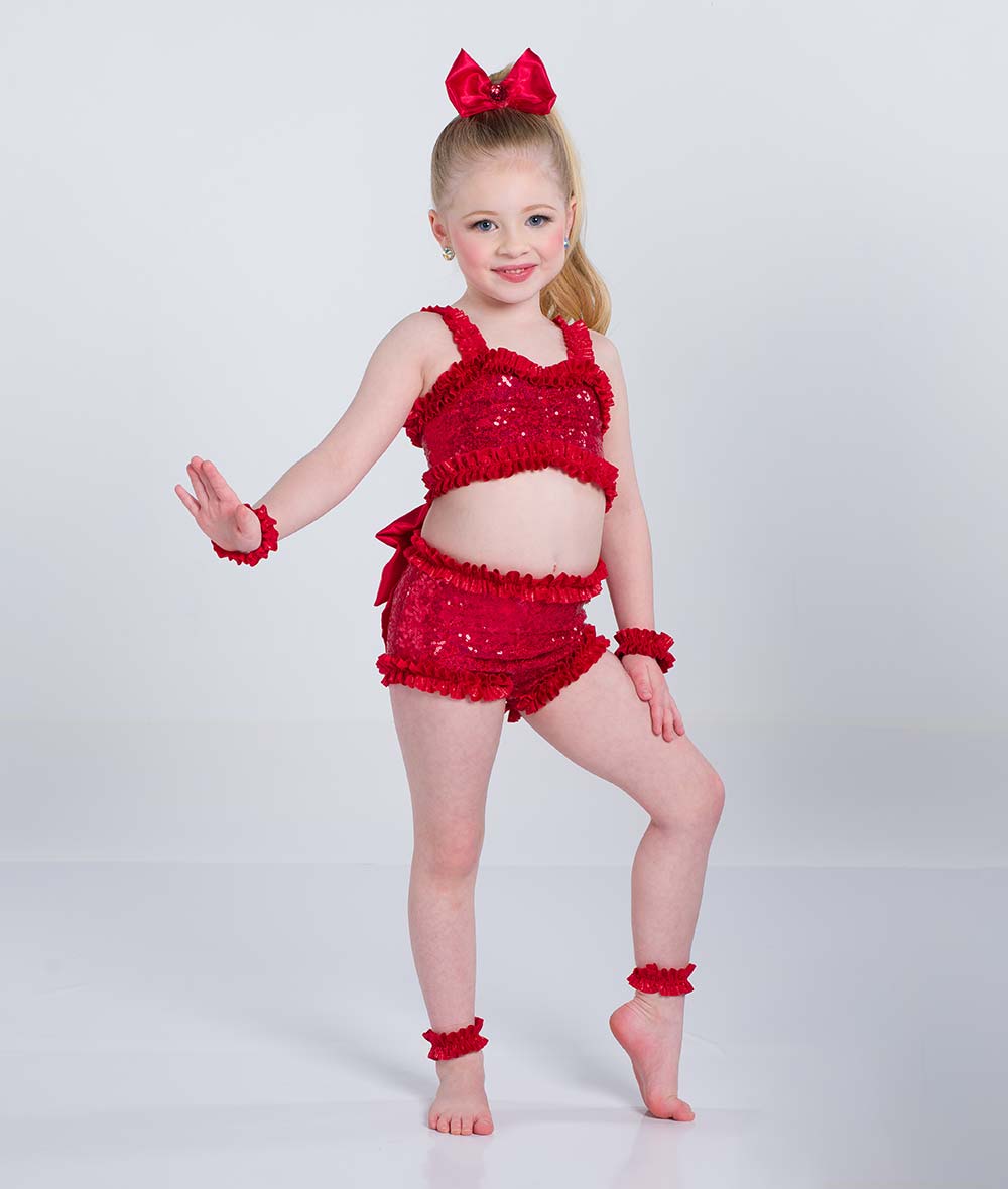 Lined elite sequin mesh bra top and twirl panty with foil lycra ruffle trim. Removable satin back bow and sequin applique on bar pins. Made in the USA.