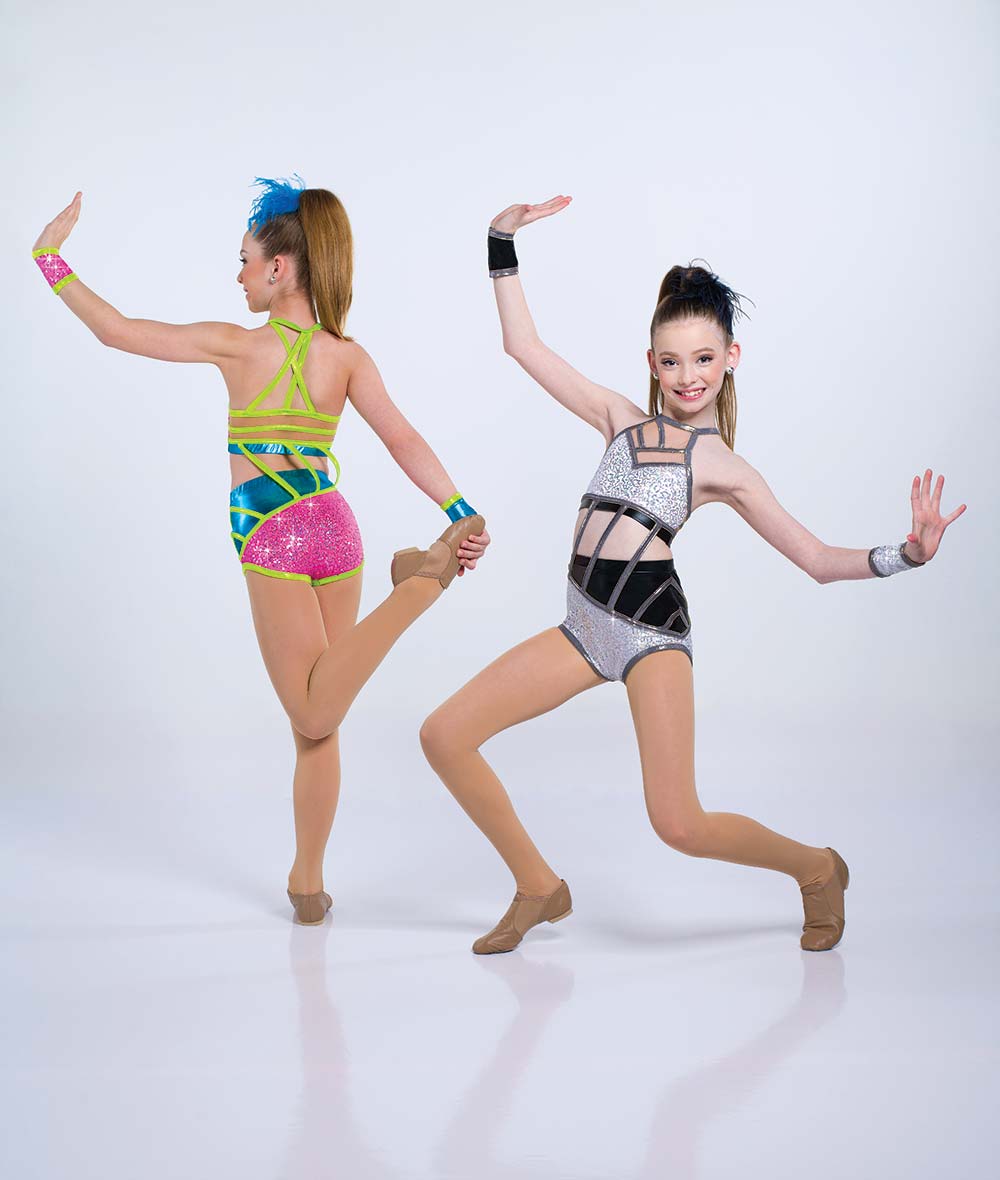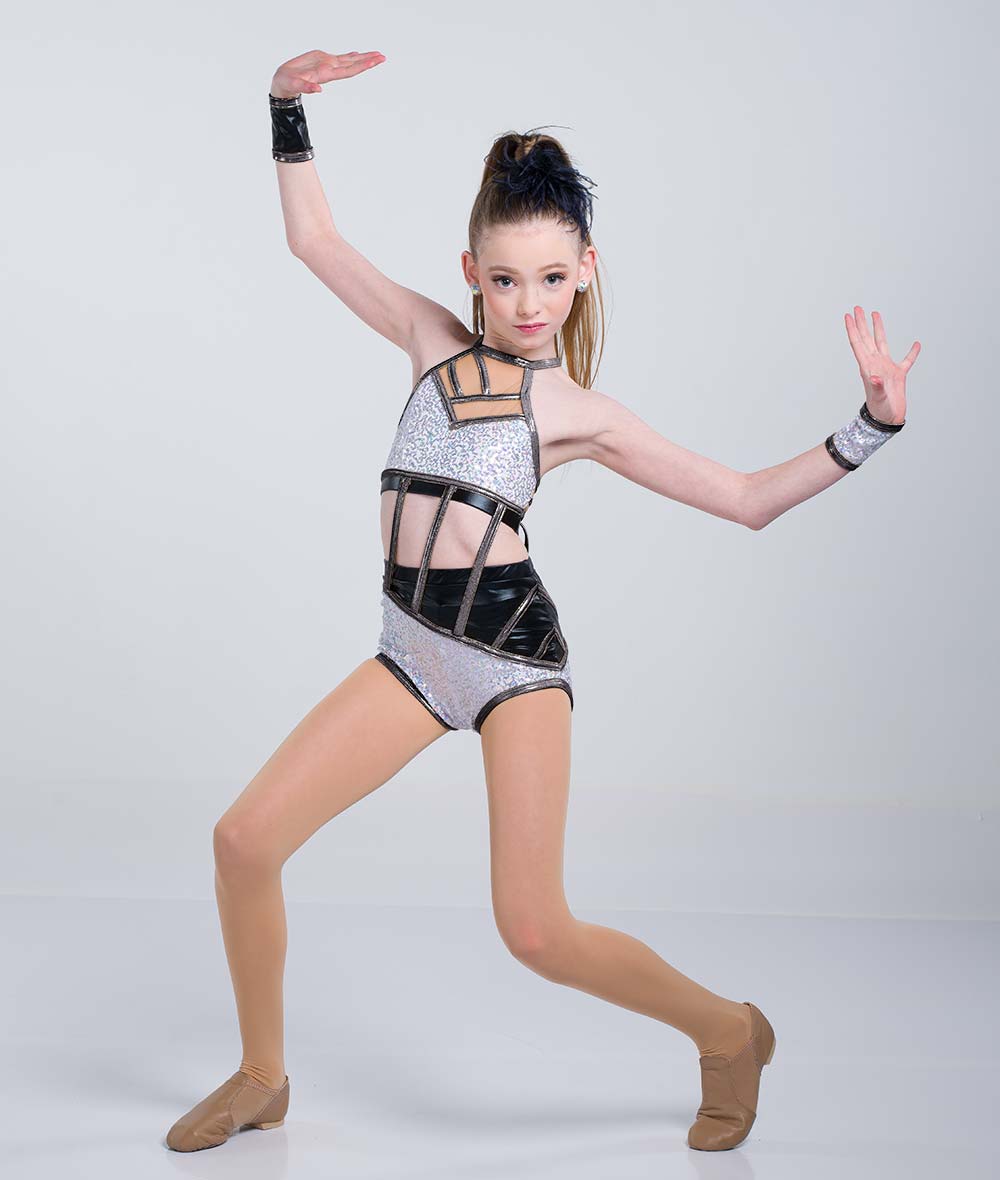 Lined sequin spandex and flat foil lycra leotard with open midriff, tan mesh lining, and foil lycra trim. Twirl panty. Made in the USA.