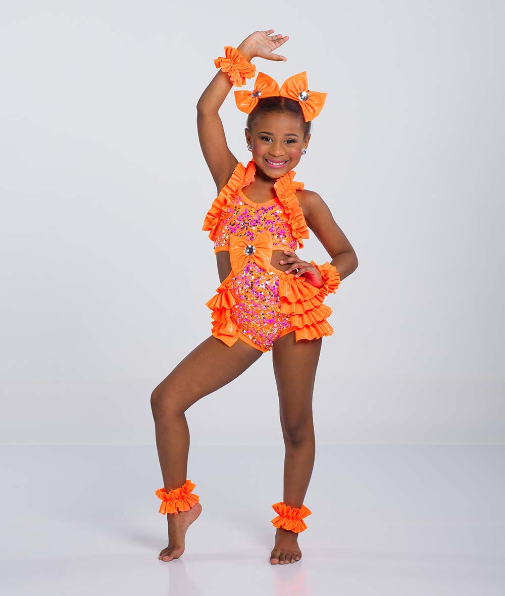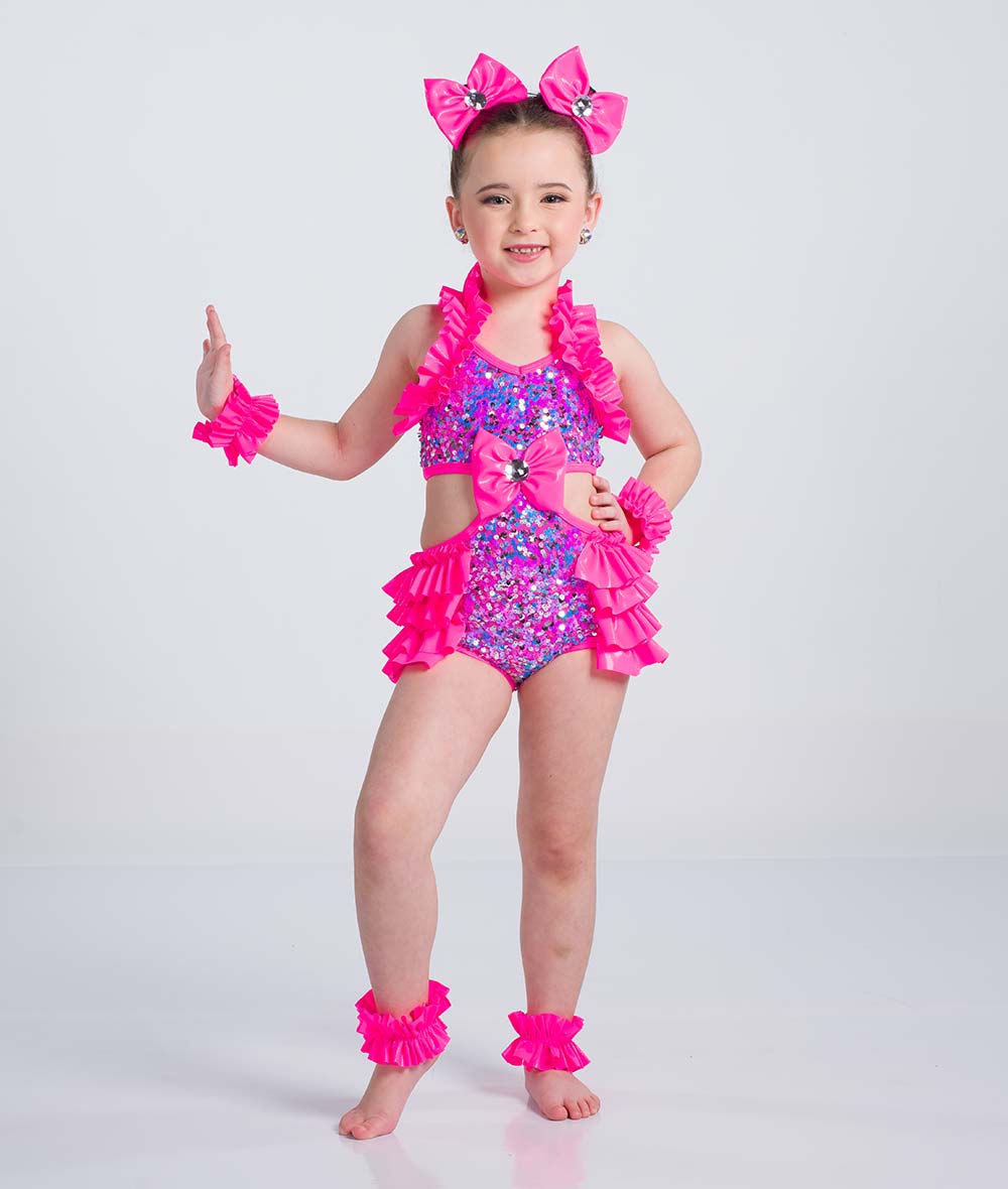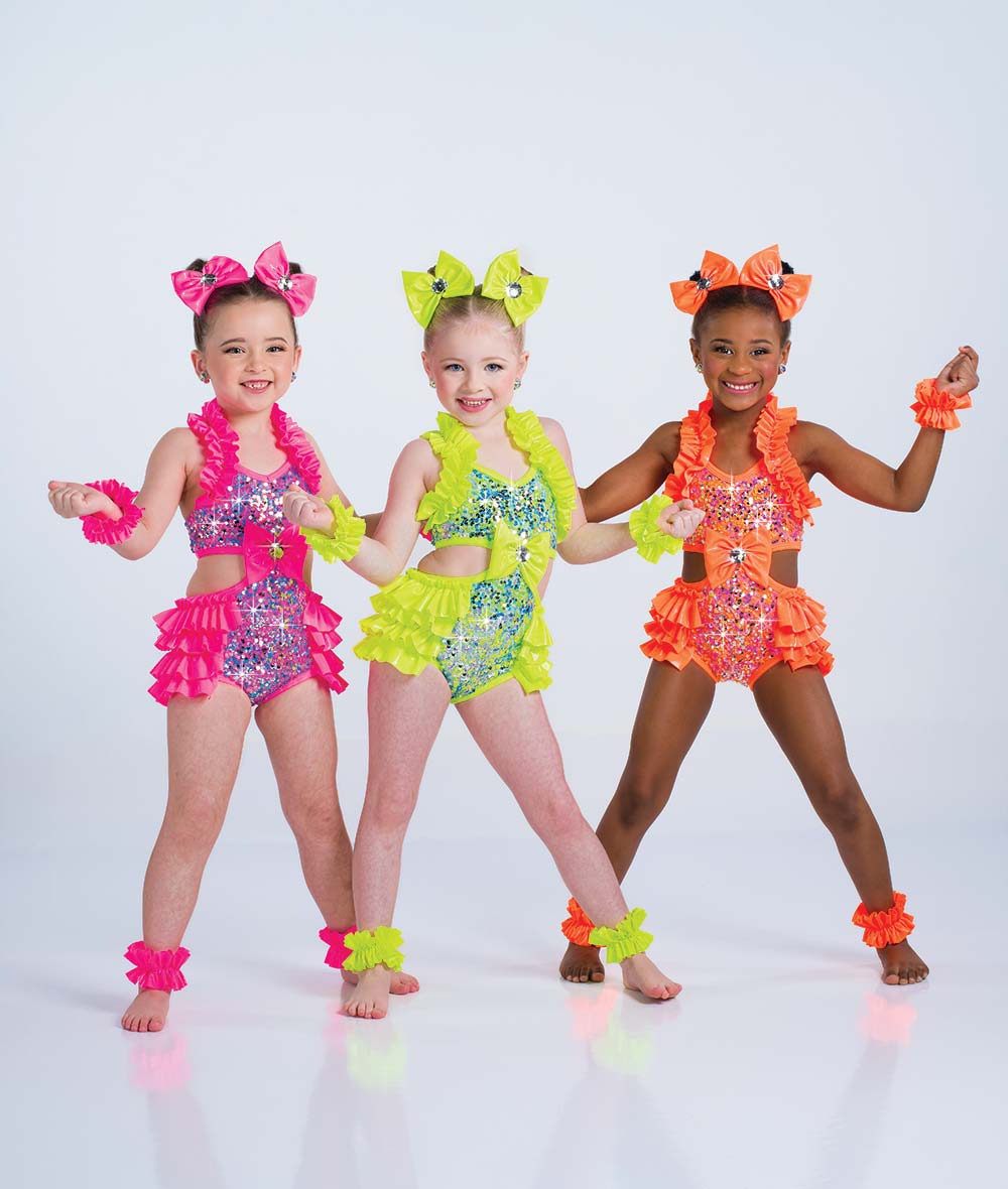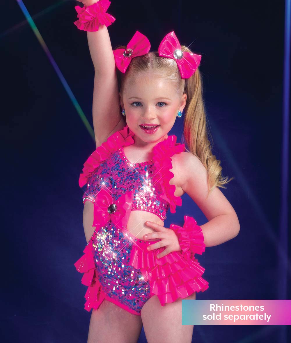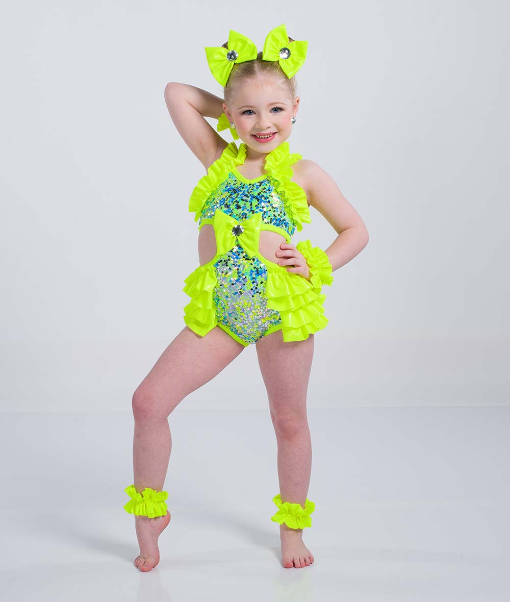 Lined multicolor sequin mesh and foil lycra leotard with midriff cutouts, ruffle butt, and trim. Attached bow and jewel. Made in the USA.