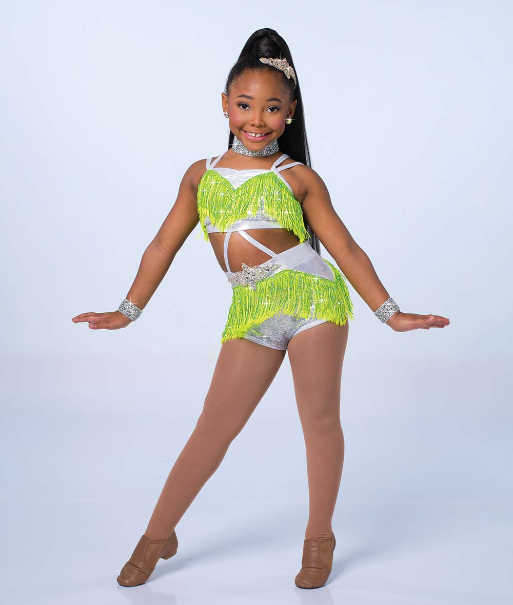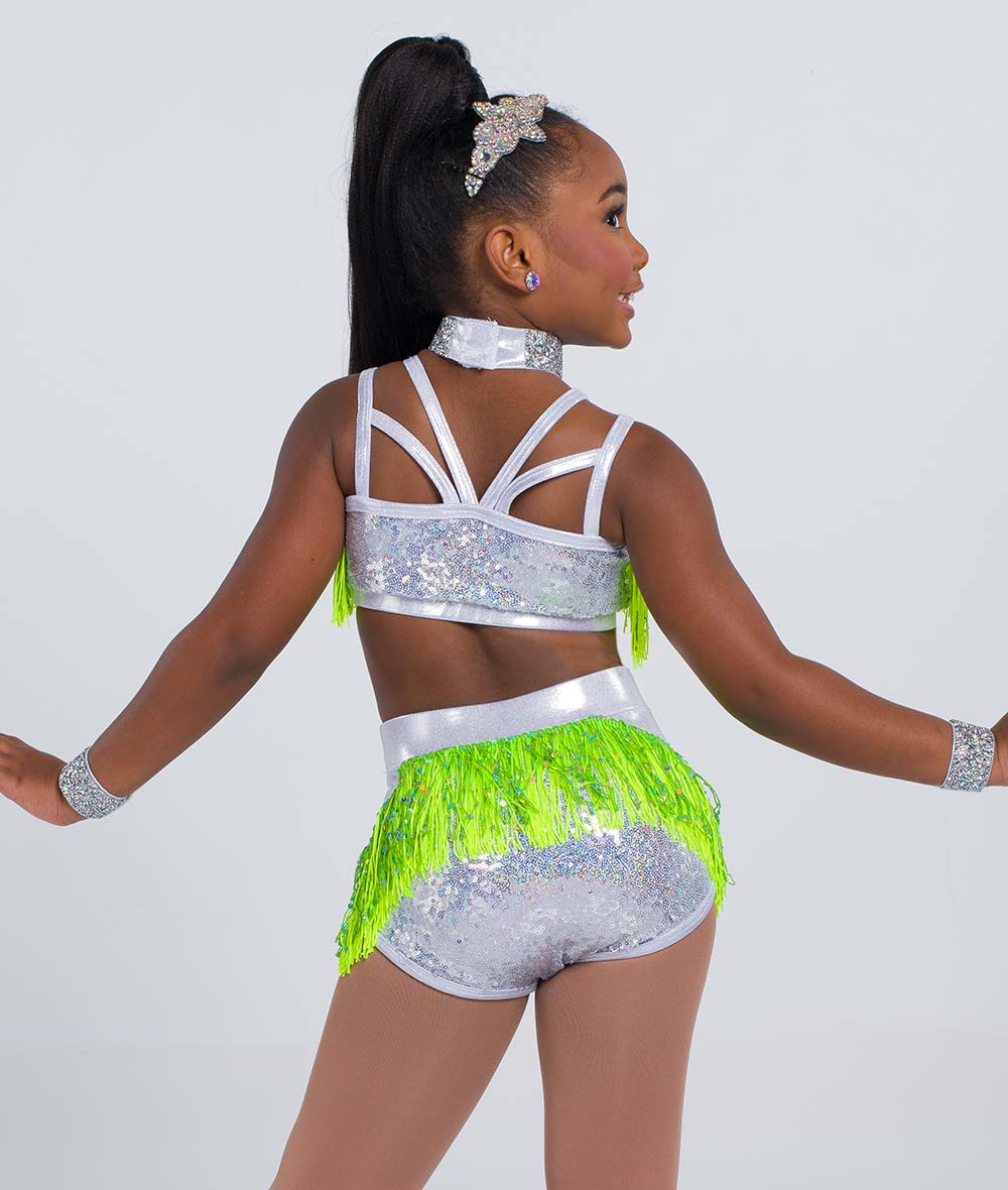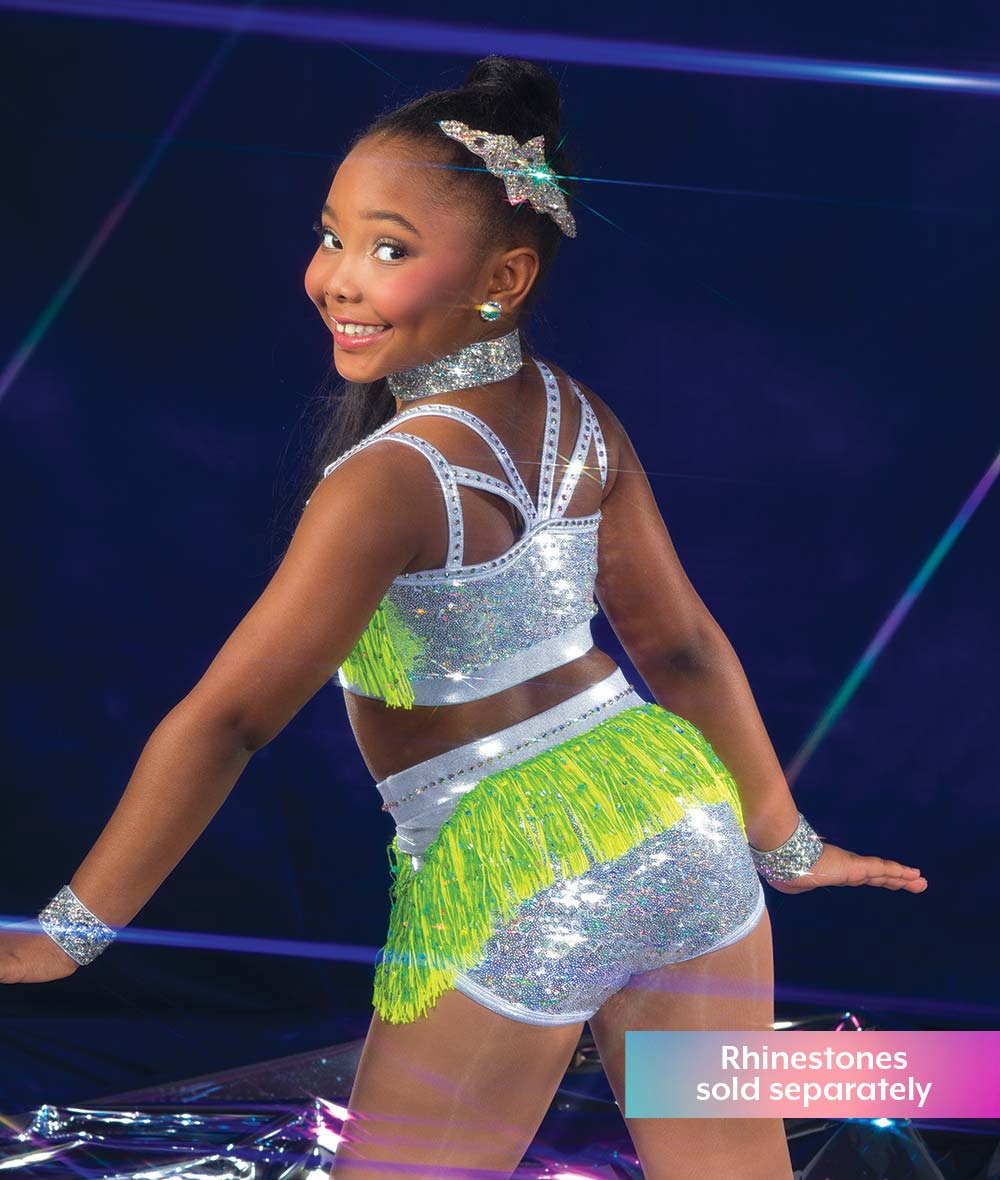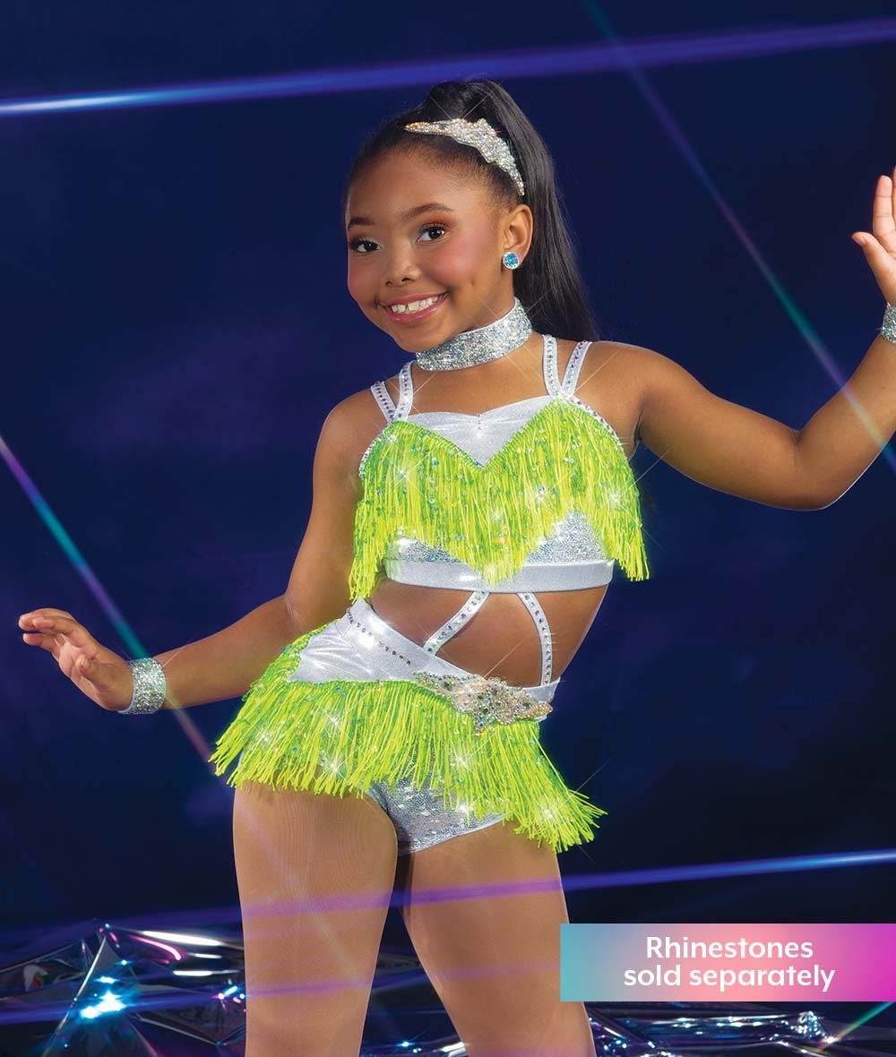 Lined elite sequin spandex and foil lycra leotard with attached sequin fringe trim and rhinestone applique. Open midriff and twirl panty. Made in the USA.