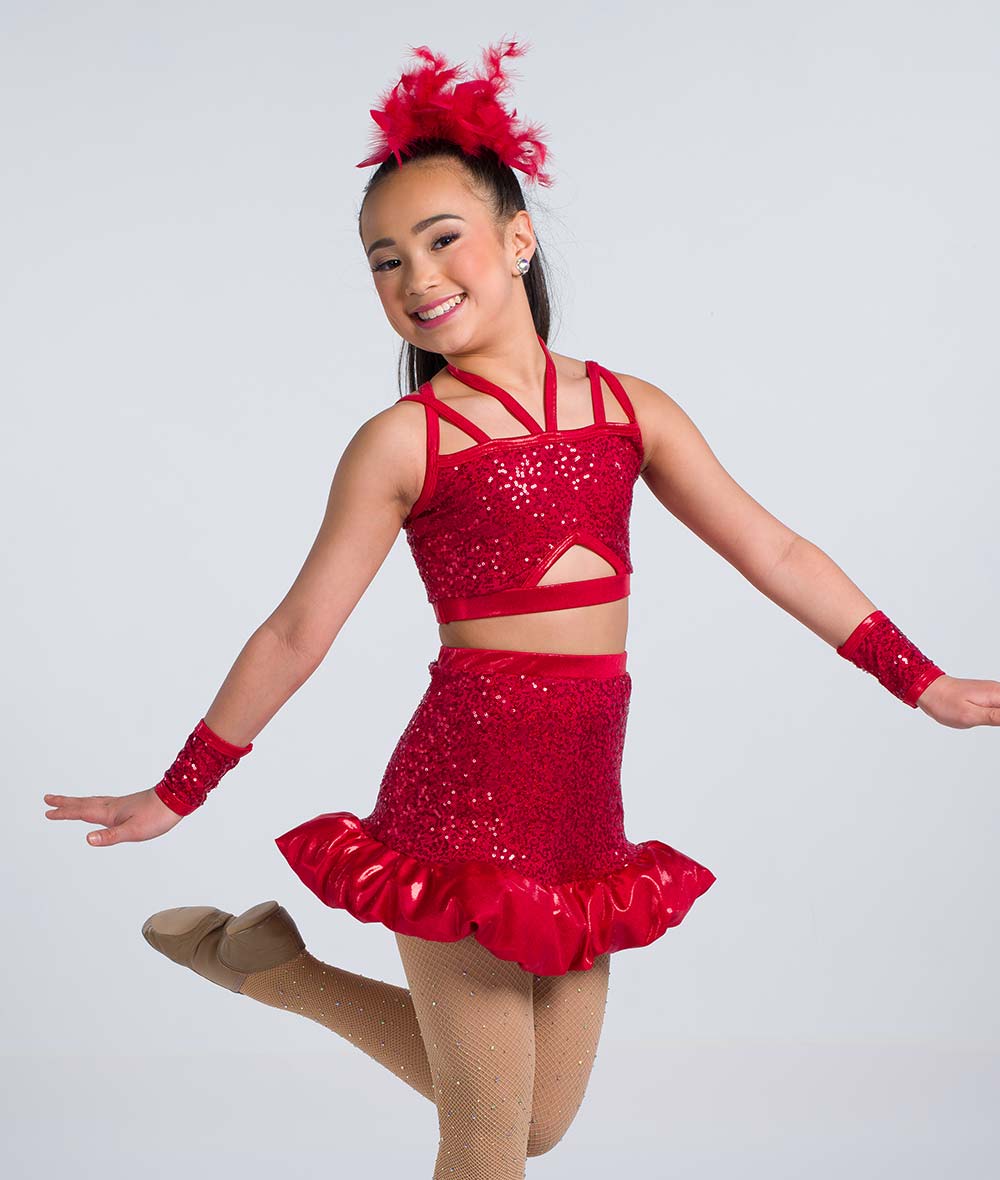 Lined sequin spandex crop top with foil lycra trim. Sequin spandex and foil lycra bubble skirt over attached hot pants. Made in the USA.