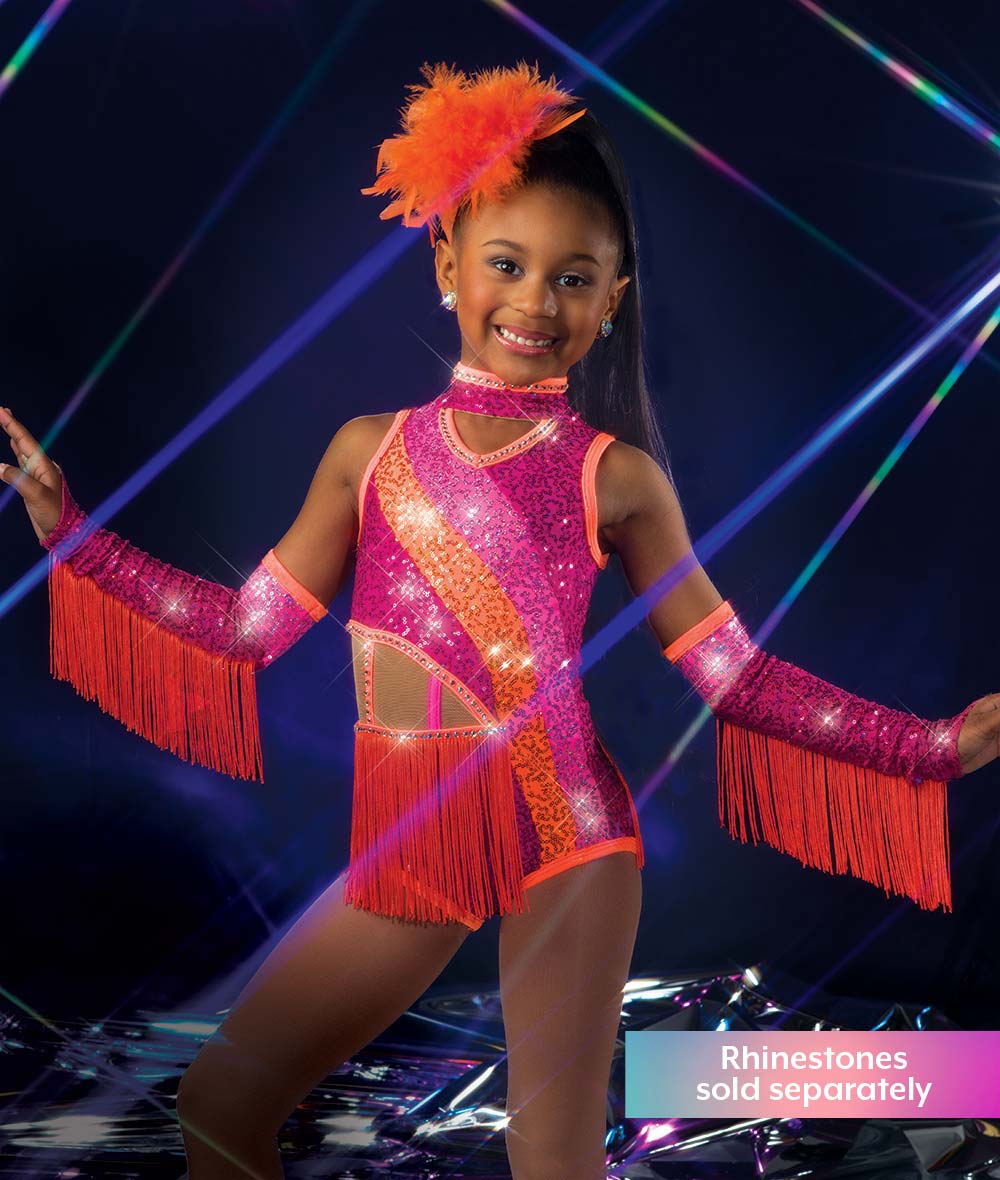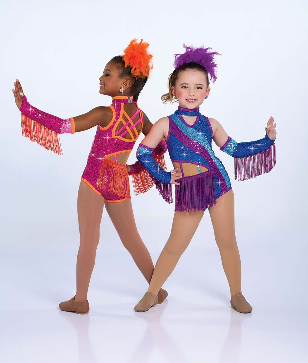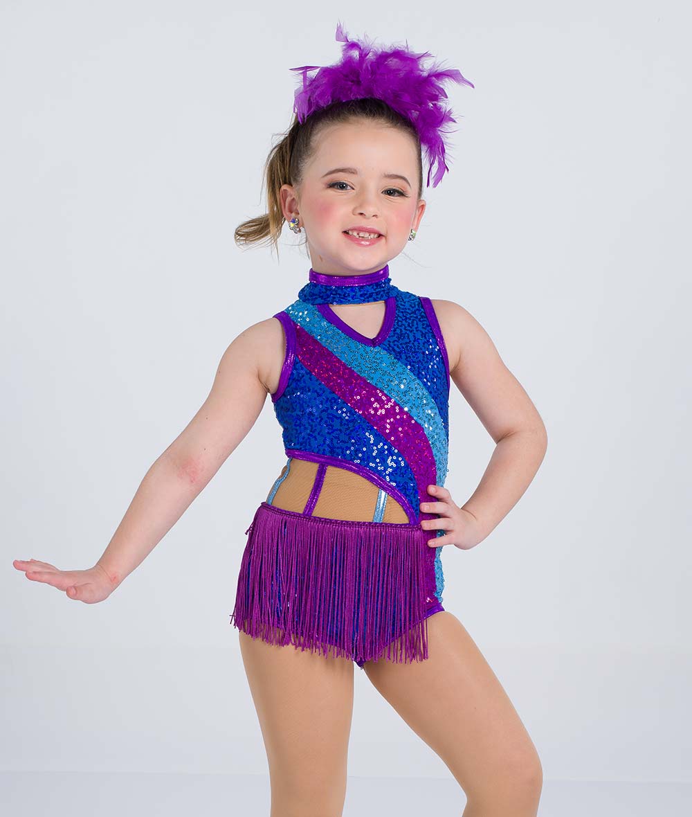 Lined color blocked sequin spandex leotard with twirl panty and foil lycra trim. Attached fringe skirt and mesh inset. Mitts sold separately. Made in the USA.