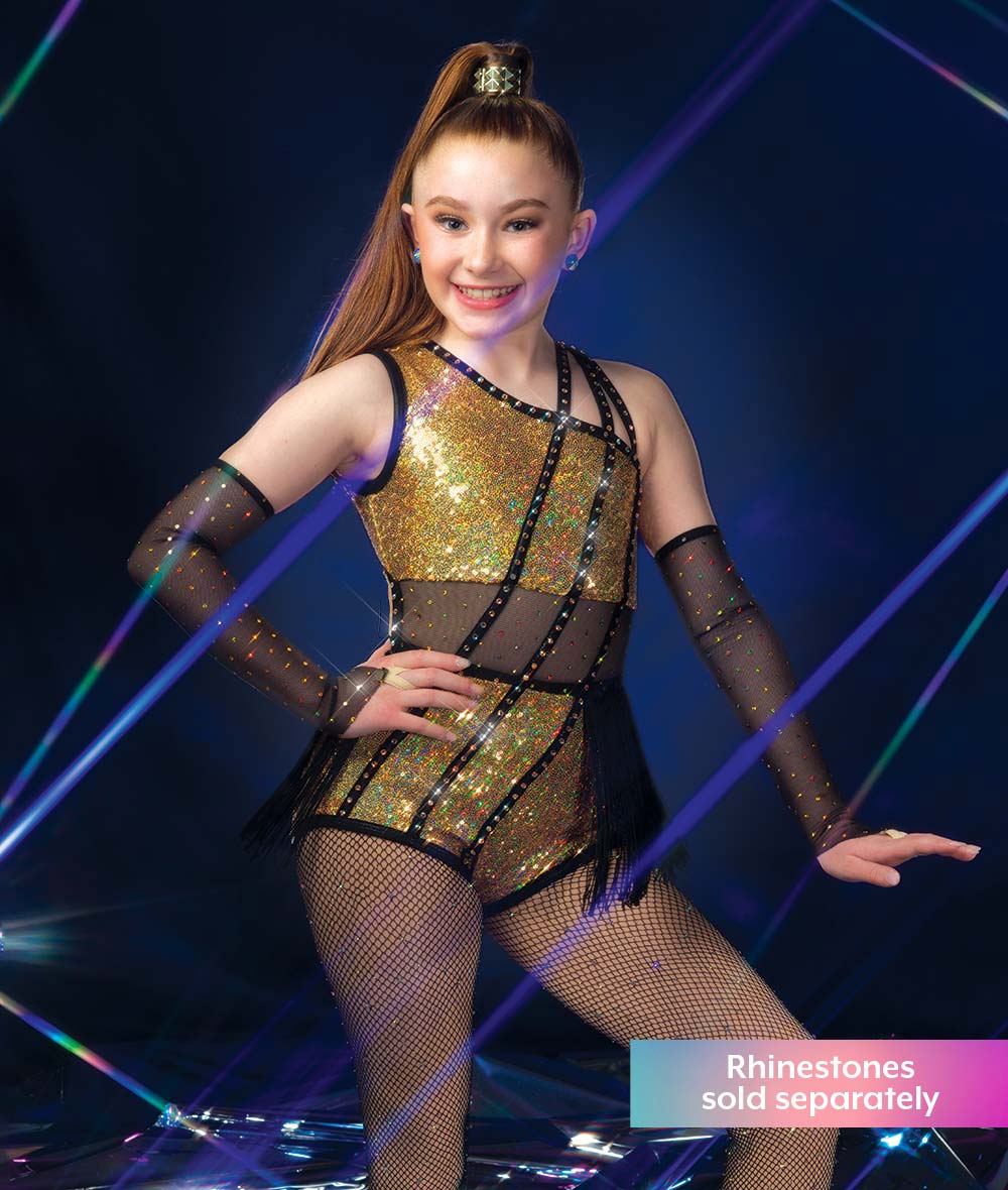 Lined elite sequin and sequin dot mesh leotard with open back, foil lycra trim, and attached fringe skirt. Twirl panty. Made in the USA.