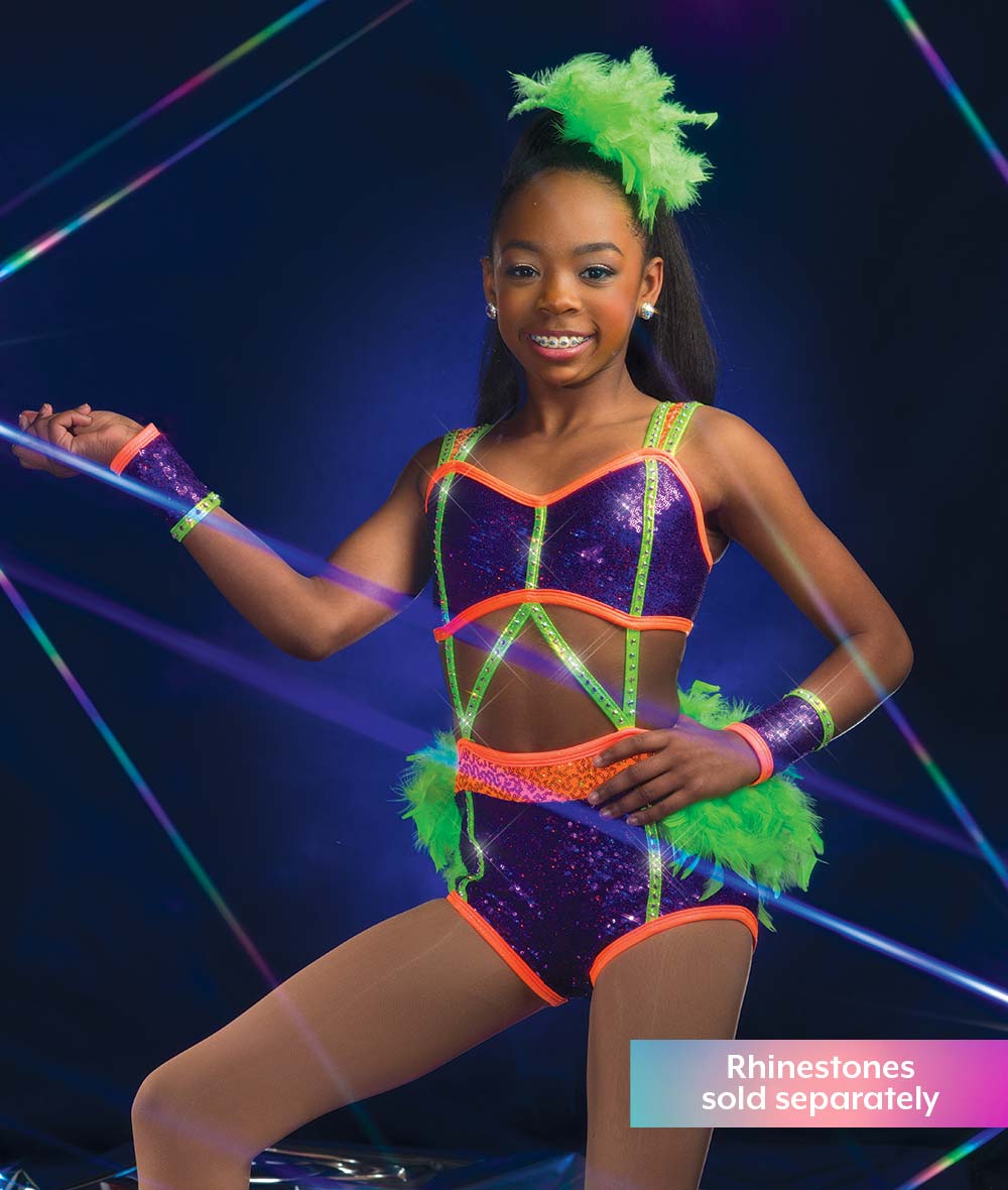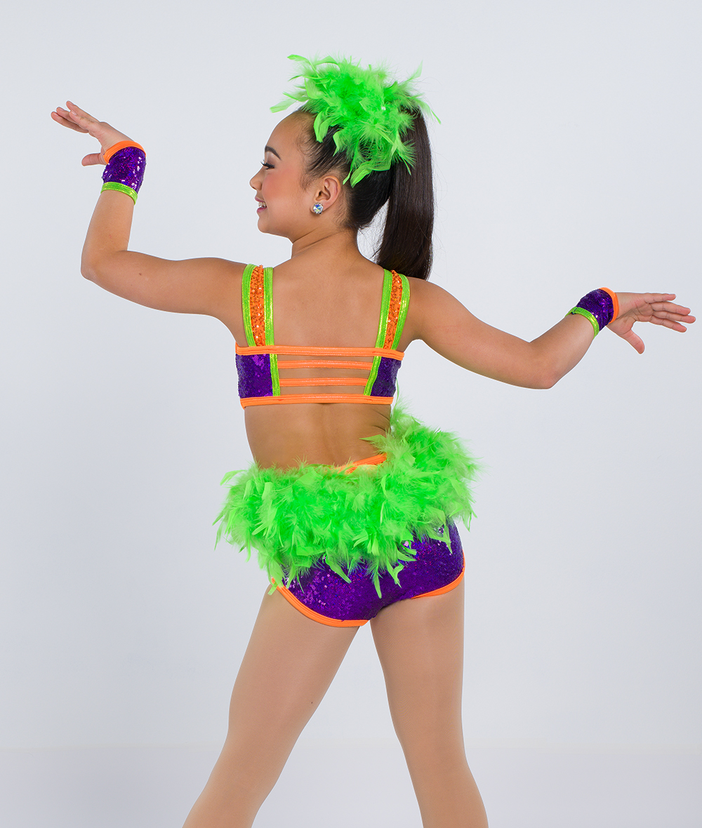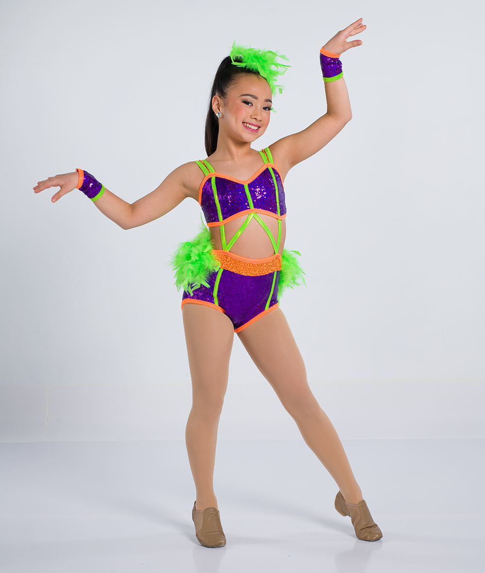 Lined elite sequin spandex leotard with open midriff, foil lycra trim, and attached boa back skirt. Twirl panty. Made in the USA.