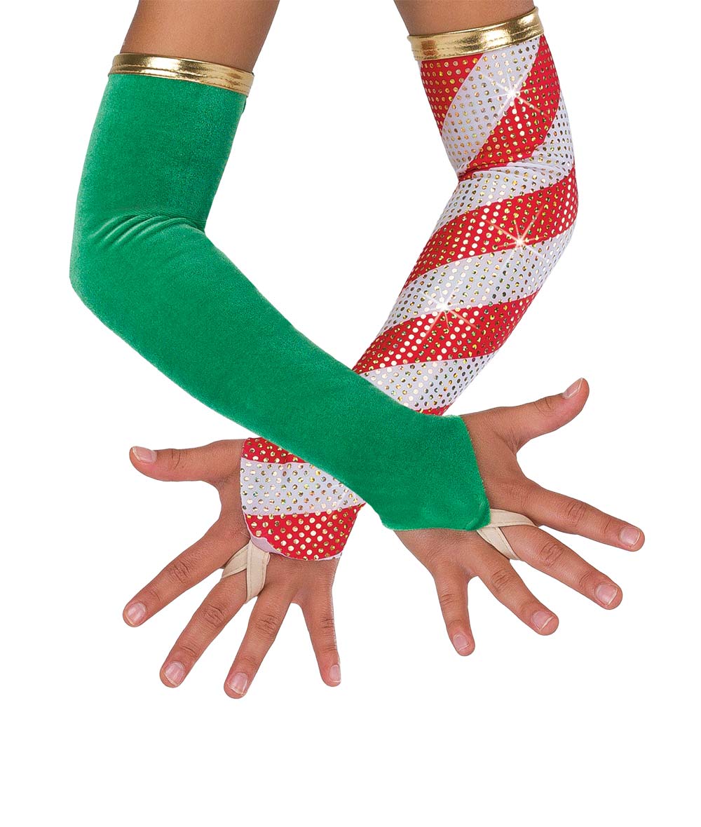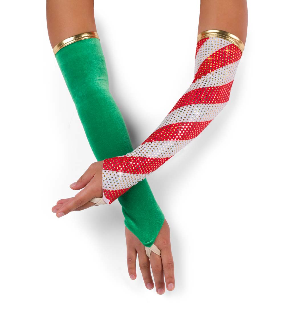 Foil dot striped spandex and velvet over -the-elbow mitts with elastic finger loops. Made in the USA.