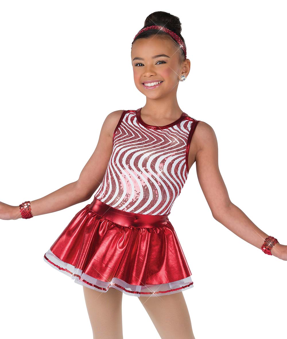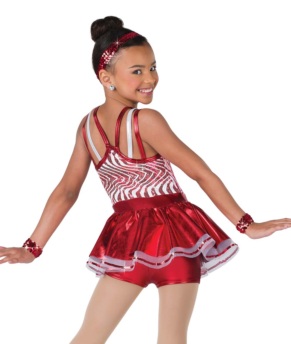 Lined wavy sequin spandex and flat foil lycra skirted shortall. Attached sequin trimmed organza crinoline. Made in the USA.