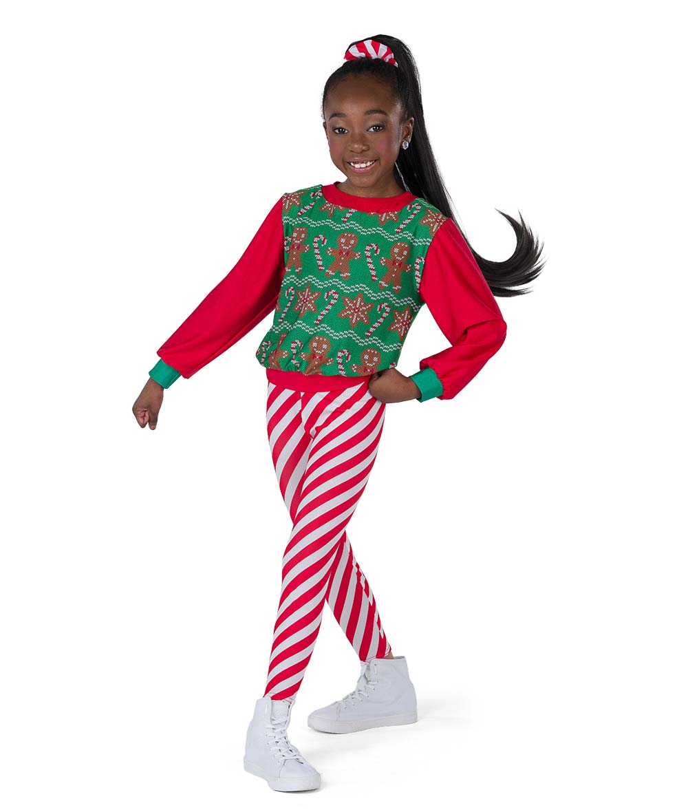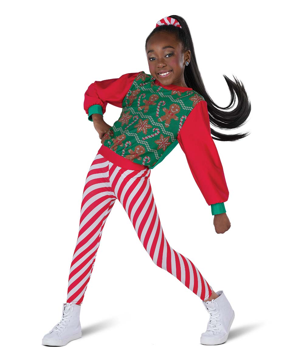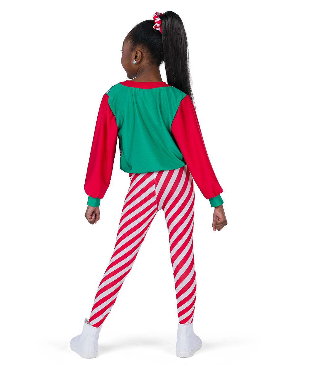 Placement print and solid spandex long sleeve top. Striped spandex leggings. Made in the USA.