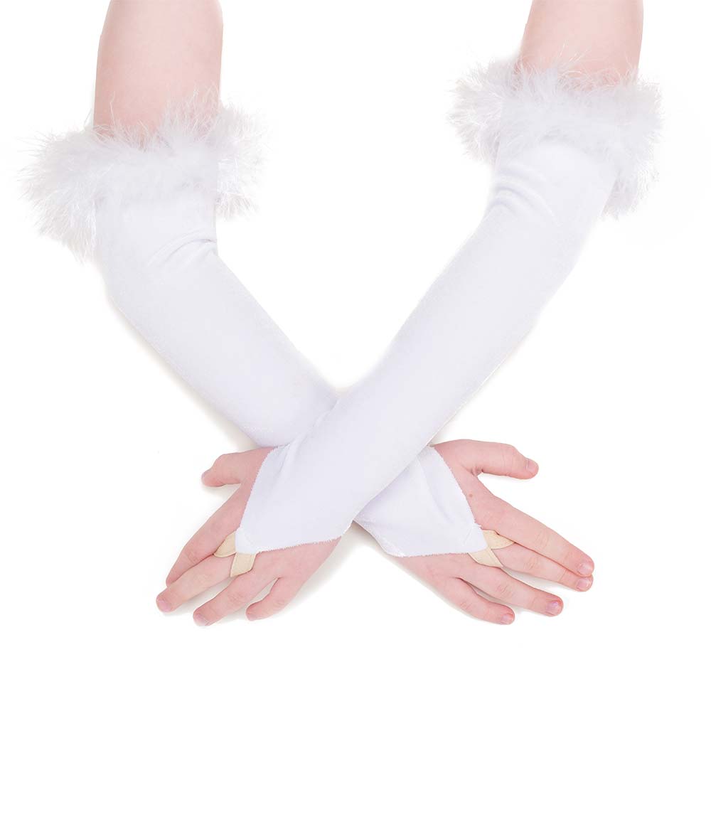 Velvet over-the-elbow mitts with marabout trim and elastic finger loop. Made in the USA.