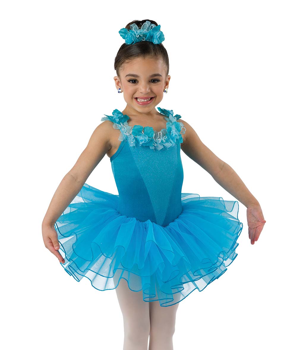 Velvet and lined glitter knit leotard with floral trim and attached lettuce edged organza tutu. Made in the USA.