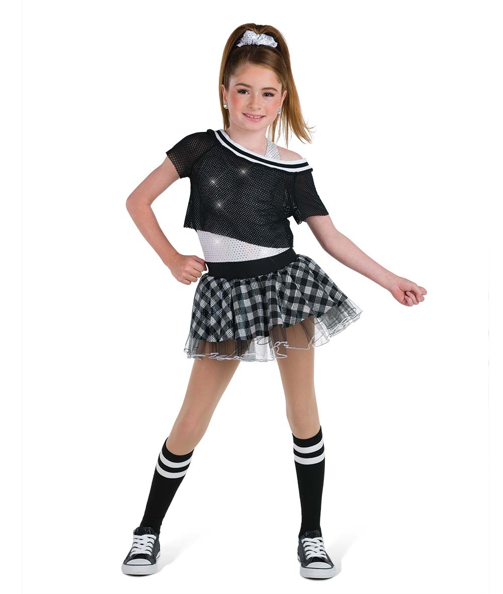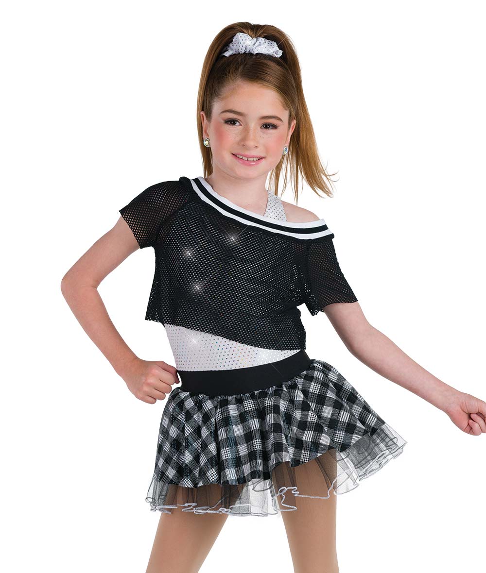 Sequin dot and solid spandex shortall with attached plaid topskirt over lettuce edged tulle skirt. Made in the USA.